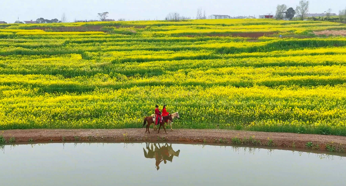 眼下,湖北省孝感市孝昌县的油菜花、桃花陆续进入盛花期,季店乡桃画山谷成了花的海洋,引来俊男靓女策马扬鞭,尽享春日好风光。