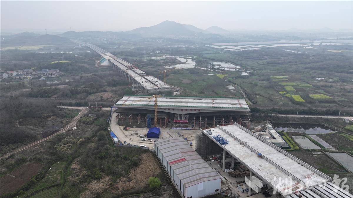 转体后,桥梁成功跨越武九铁路。(湖北日报全媒记者 林晶 通讯员 孙震 摄)