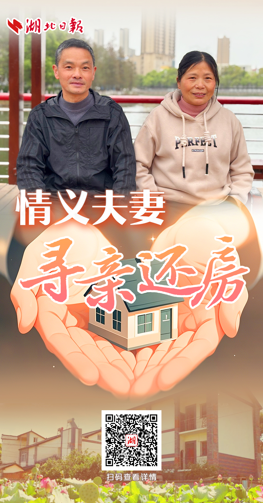 湖北日报“情义夫妻”寻亲还房相关报道海报图。(资料图)