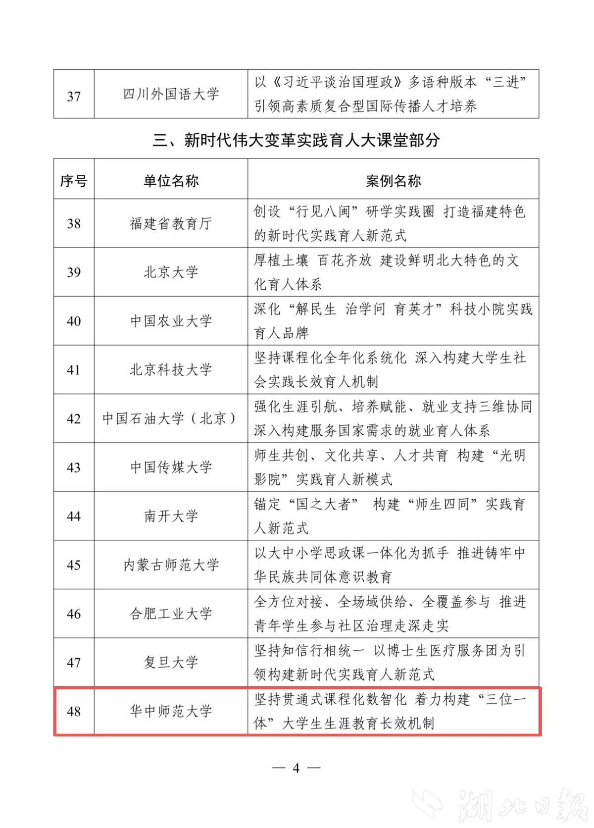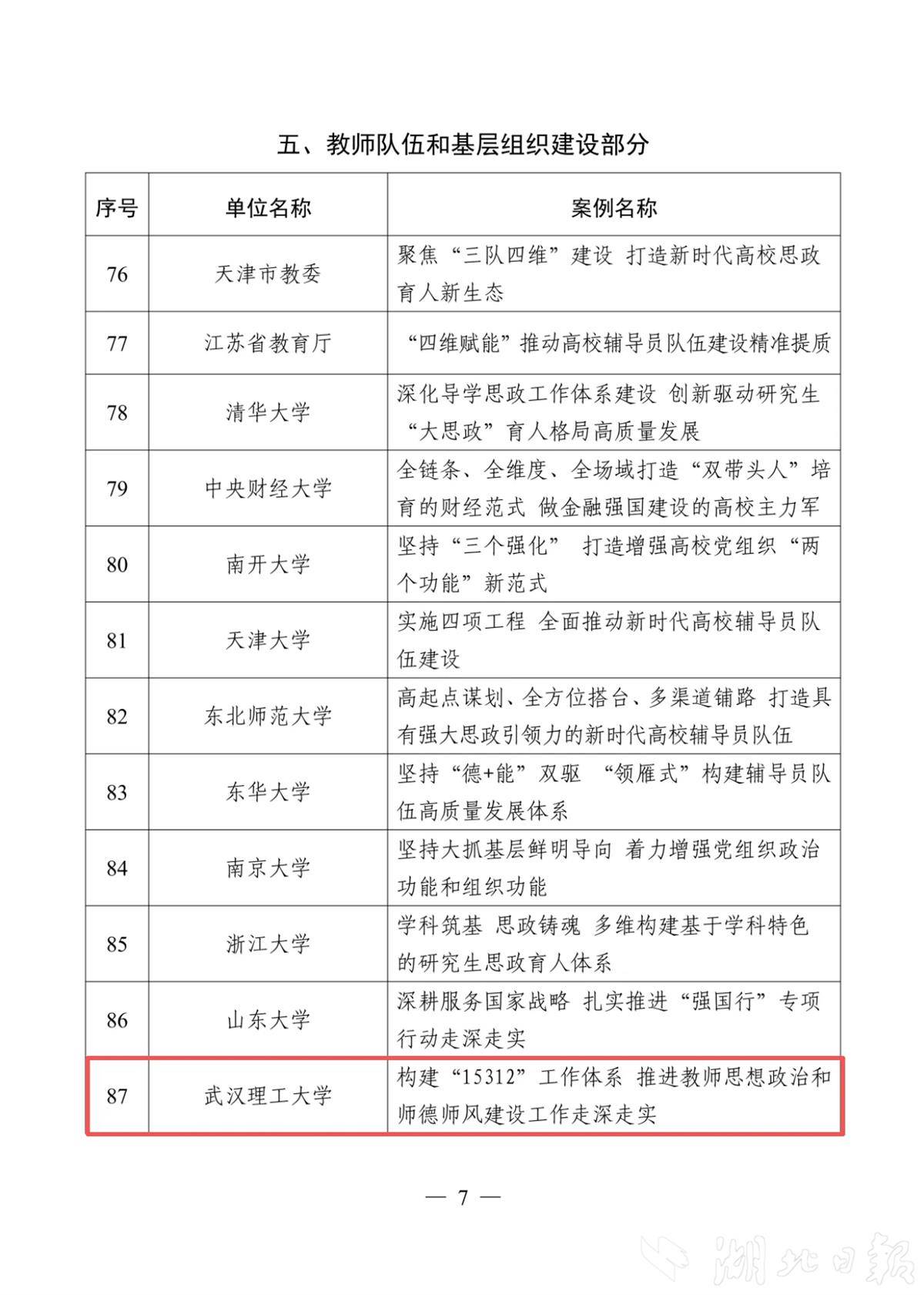 湖北日报讯(记者陈熹、通讯员梁炜)3月26日从省教育厅获悉,在教育部近日发布首批新时代学校思想政治教育典型案例名单,湖北省教育厅及华中科技大学、华中师范大学、武汉理工大学、中南财经政法大学、武汉科技大学、湖北三峡职业技术学院、武汉东湖学院等七所高校的典型案例榜上有名。