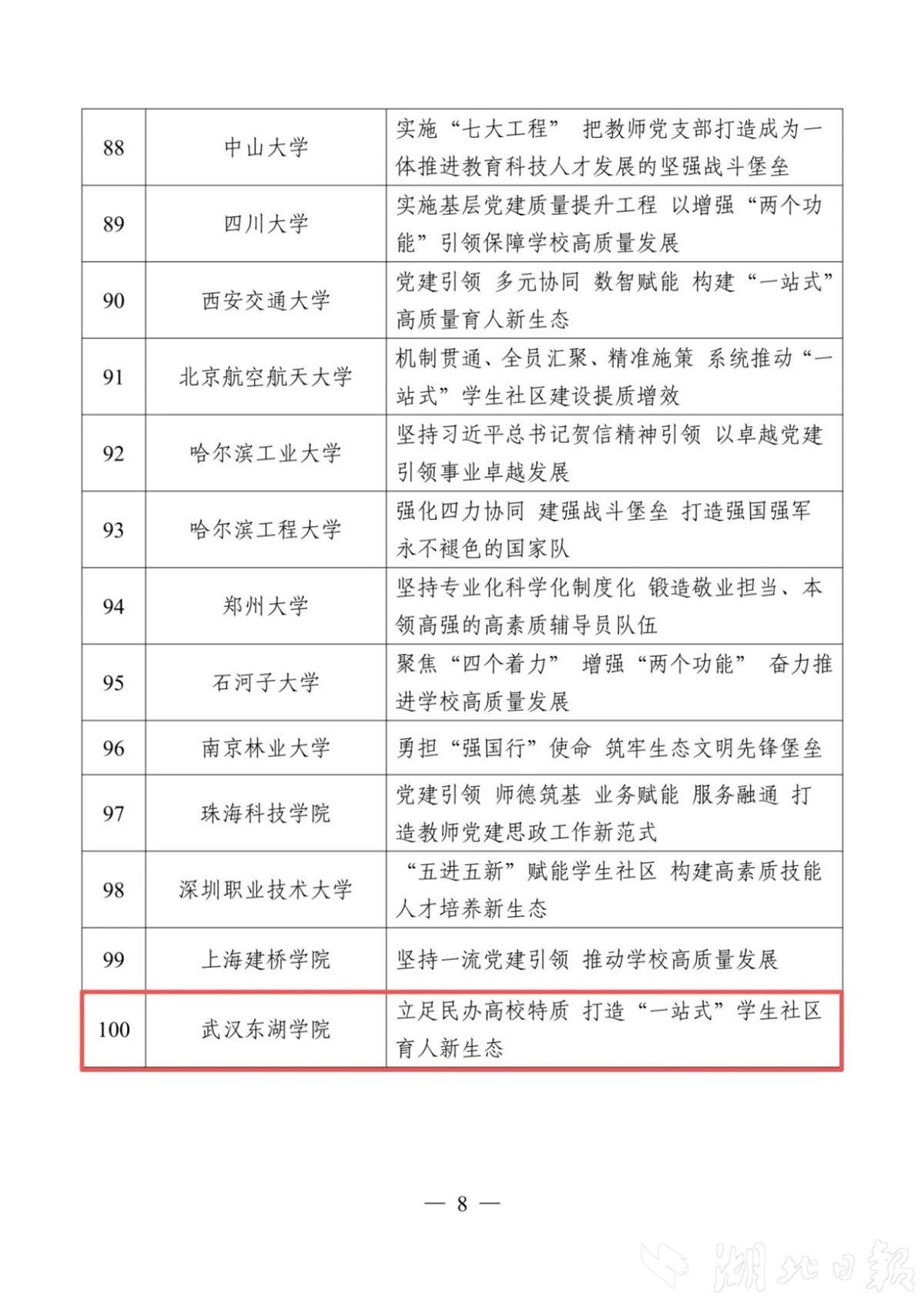 在“党的创新理论主课堂”“新时代伟大变革实践育人大课堂”“数字时代网络育人新课堂”“教师队伍和基层组织建设”等板块中,华中科技大学、华中师范大学、武汉理工大学、中南财经政法大学、武汉科技大学、湖北三峡职业技术学院、武汉东湖学院等湖北高校同样表现突出,充分体现了我省在推动思政工作高质量发展中的积极探索和扎实成效。
