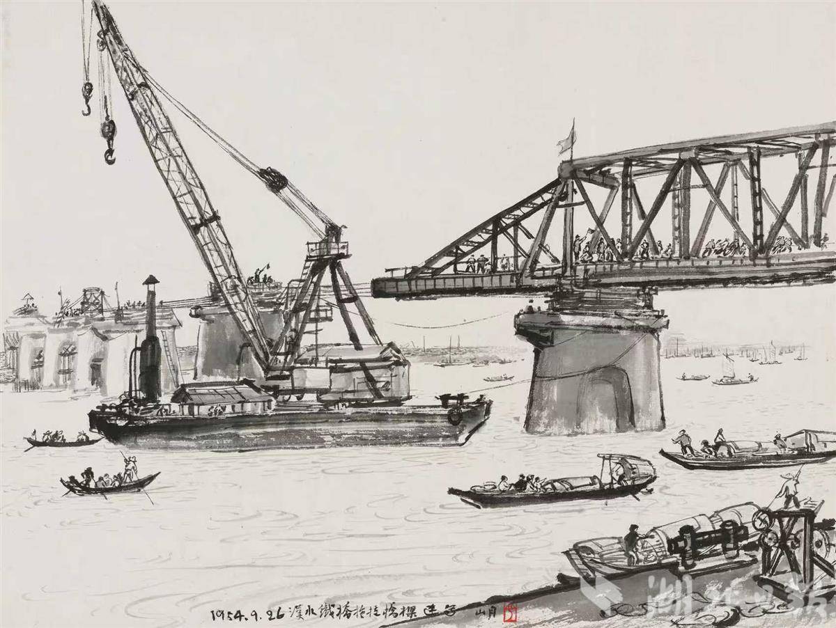 关山月《汉水大桥在建设中》国画速写 1954年 深圳市关山月美术馆藏