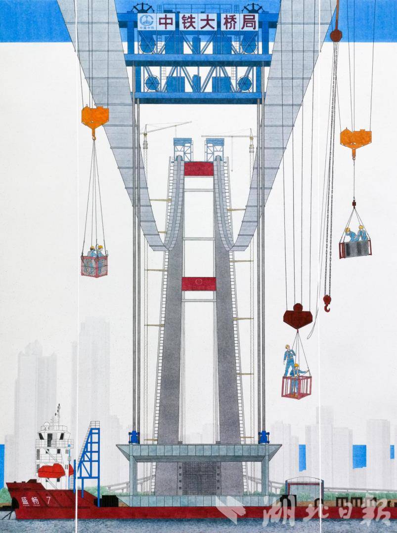 展览分“图史相彰”“图绘互嵌”“图闻知时”三个部分,以“时间的刻度”为视角,呈现图像与历史、图像与图像之间的关系,进而展现新中国工业发展的精神图谱与新时代的向新而行。从新中国工业叙事到新时代文化叙事,武汉长江大桥所激发出的艺术创作无不交织在“带入国家情怀的抒写”和“带入生活温度的观察”之中,而“人民性”则是贯穿作品创作的主题。