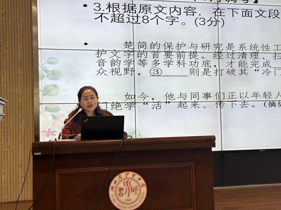 同时,赵老师结合荆州市二调真题与楚简保护等情境化补写题,示范了“定位原文—逻辑衔接—精准概括”的解题流程,帮助老师们突破信息类文本阅读的教学难点,助力老师们在教学中更有效地提升学生应对情境化题目的解题能力。