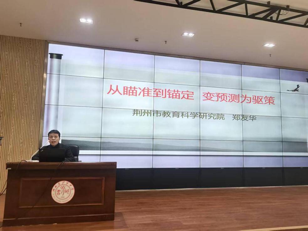 同日上午,工作室成员、荆州市语文教学专家、市教育科学研究院高中语文教研员郑友华老师以《从瞄准到锚定,变预测为驱策》为题,立足高考真题“历史纵贯线”,系统梳理了近年语文高考命题特征与变化规律。他通过对比2021年新高考Ⅱ卷、2022年全国甲卷等典型真题,深入分析了成语运用、情境补写等题型的命题逻辑与考查导向,强调备考要从“被动预测”转向“主动驱策”,锚定课标与高考评价体系,实现精准发力。