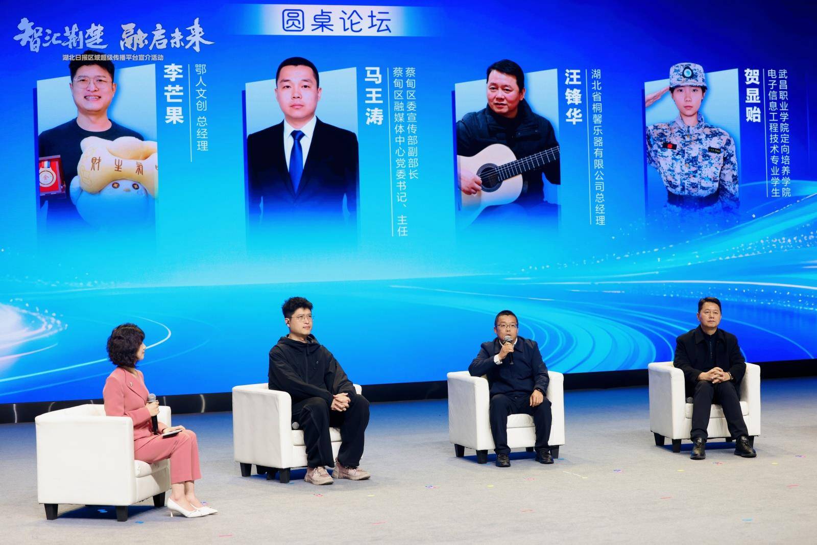 宣介活动现场,一场圆桌对话将活动推向高潮。鄂人文创总经理李芒果、蔡甸区融媒体中心主任马王涛、桐馨乐器总经理汪锋华、武昌职业学院学生贺显贻,以及一位特殊的“AI麋鹿”代表围坐一堂,共同探讨:源自湖北的故事,如何从“本土回响”激荡成“全国共鸣”?