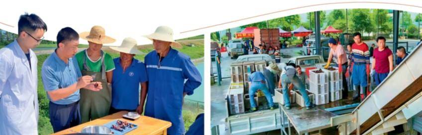 左图:湖北省小龙虾产业技术研究院开展“田间课堂”;右图:小龙虾收购现场。