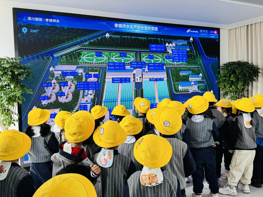 在反应池和沉淀池,讲解员用“魔法药剂”的生动比喻,讲解混凝剂的作用,引导孩子们观察水中杂质凝结成絮状物并沉淀的过程;在滤池,工作人员现场演示过滤原理,让孩子们直观感受水的净化效果;在清水池,孩子们了解到洁净水的储存与调配方式;在送水泵房和调度室,自动化供水设备、城市供水管网实时运行画面,让孩子们真切感受到城市供水系统的智慧与高效,读懂了每一滴水从水厂到家中水龙头的完整旅程。