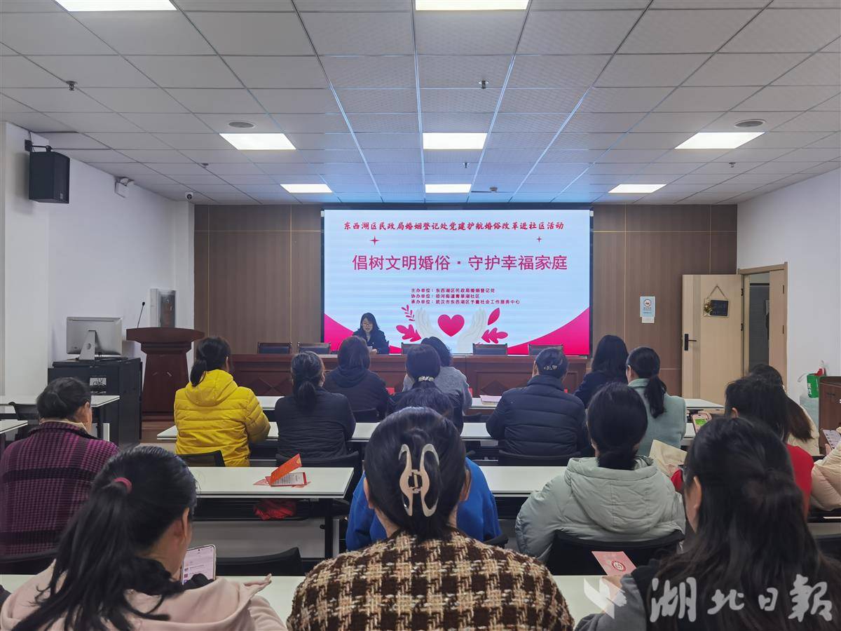 湖北日报讯(记者李光正、通讯员张丽霞)3月26日,武汉市东西湖区民政局婚姻登记处联合青草湖社区,开展“倡树文明婚俗·守护幸福家庭”活动,通过“政策宣讲、家风培育、公益咨询、矛盾调解”一站式服务,打通婚姻家庭服务“最后一公里”。