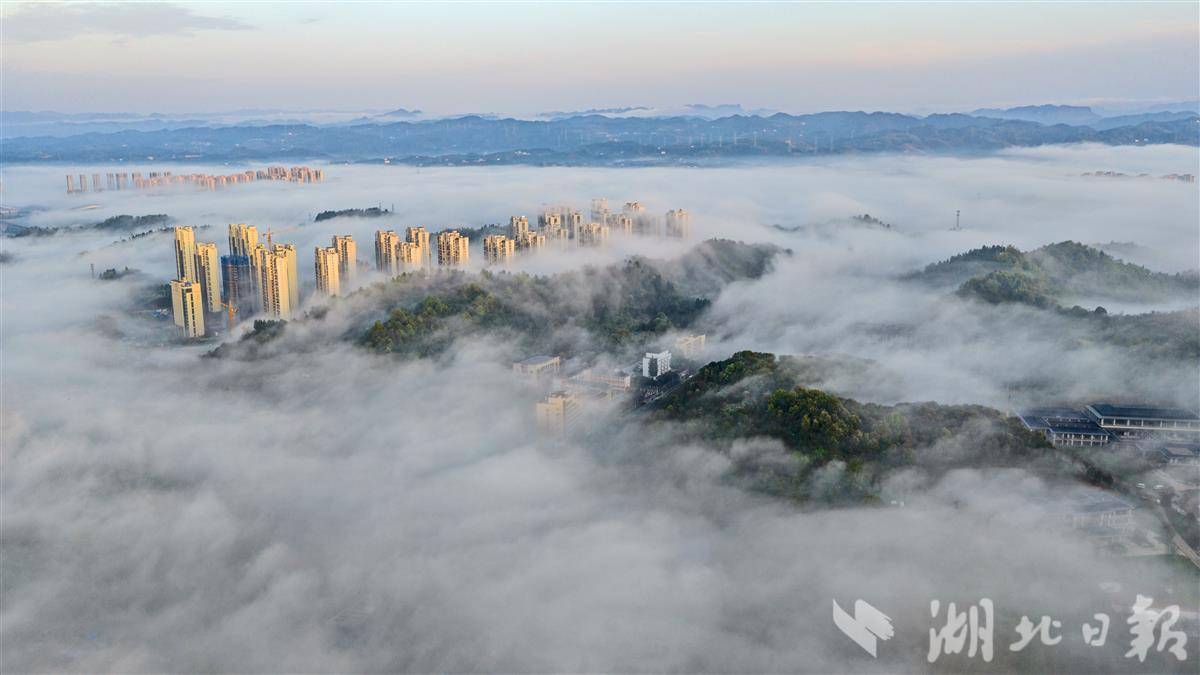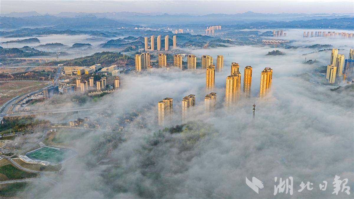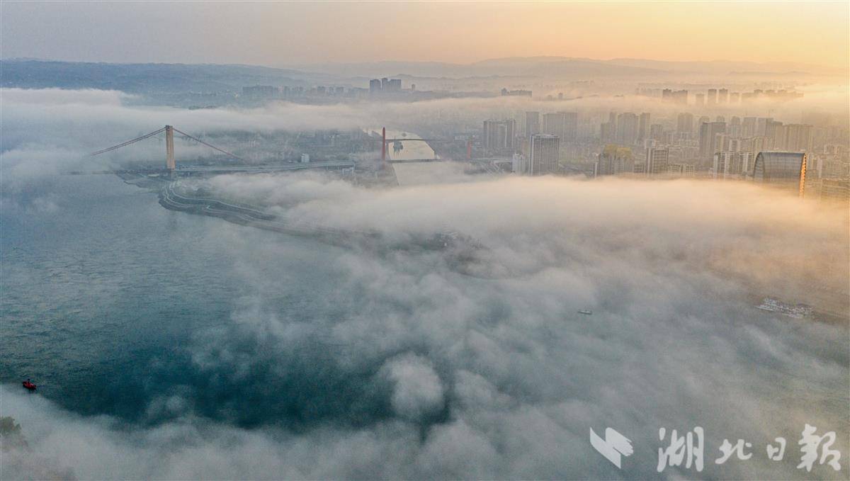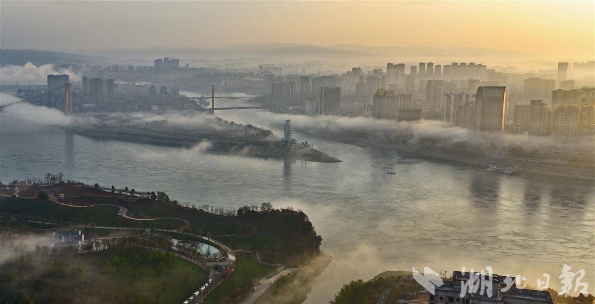 长江宜昌段云雾漫卷、水汽氤氲。一江碧水穿城而过,楼宇山峦隐现于缥缈雾霭之间,城与山相融、江与云共生。