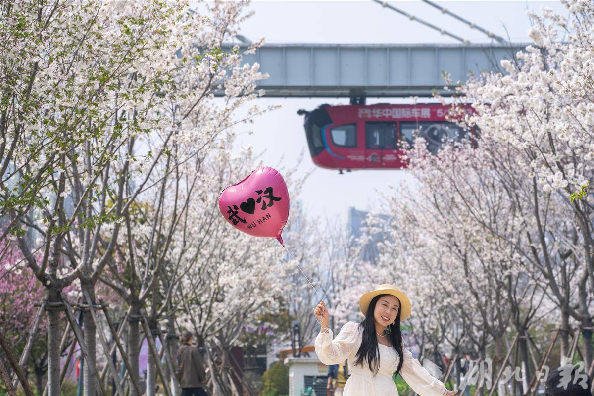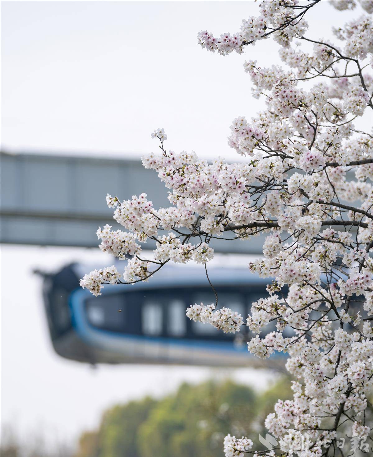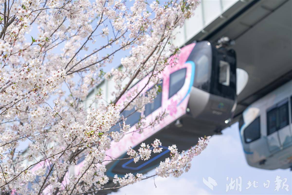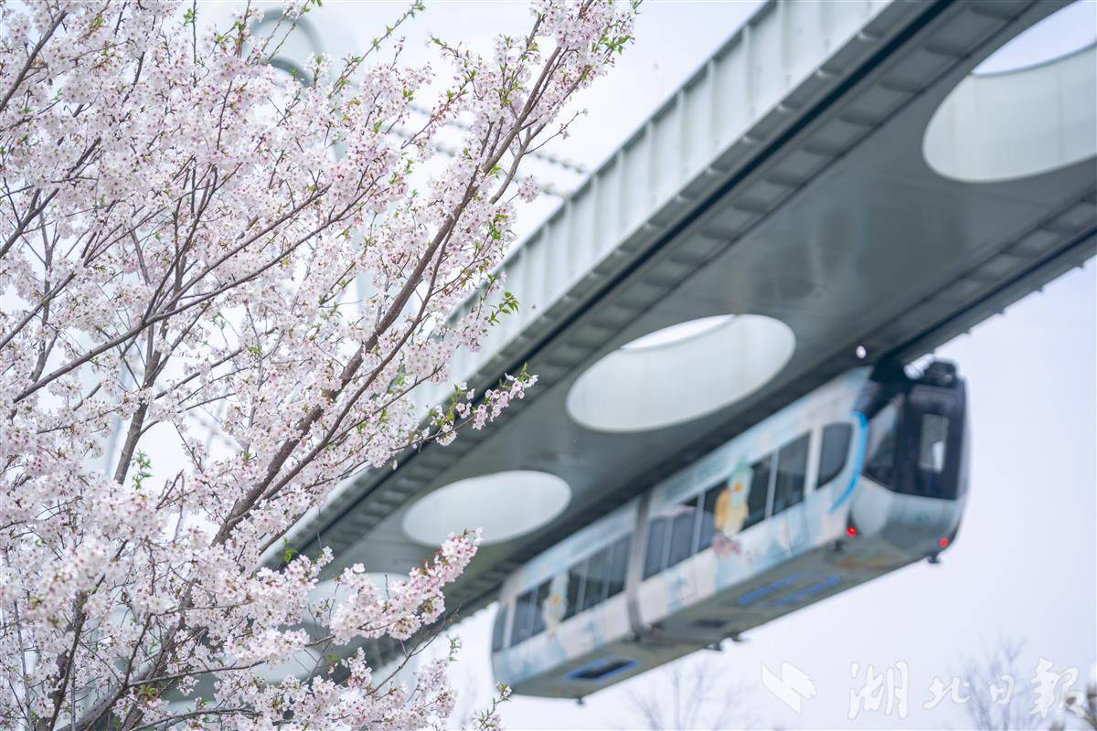 3月27日,武汉东湖高新区光谷空轨高新大道站,空轨穿梭在粉白樱林上空,空轨+樱花同框,随手一拍就是赛博感满满的春日大片,成为打卡光谷的标志性场景。