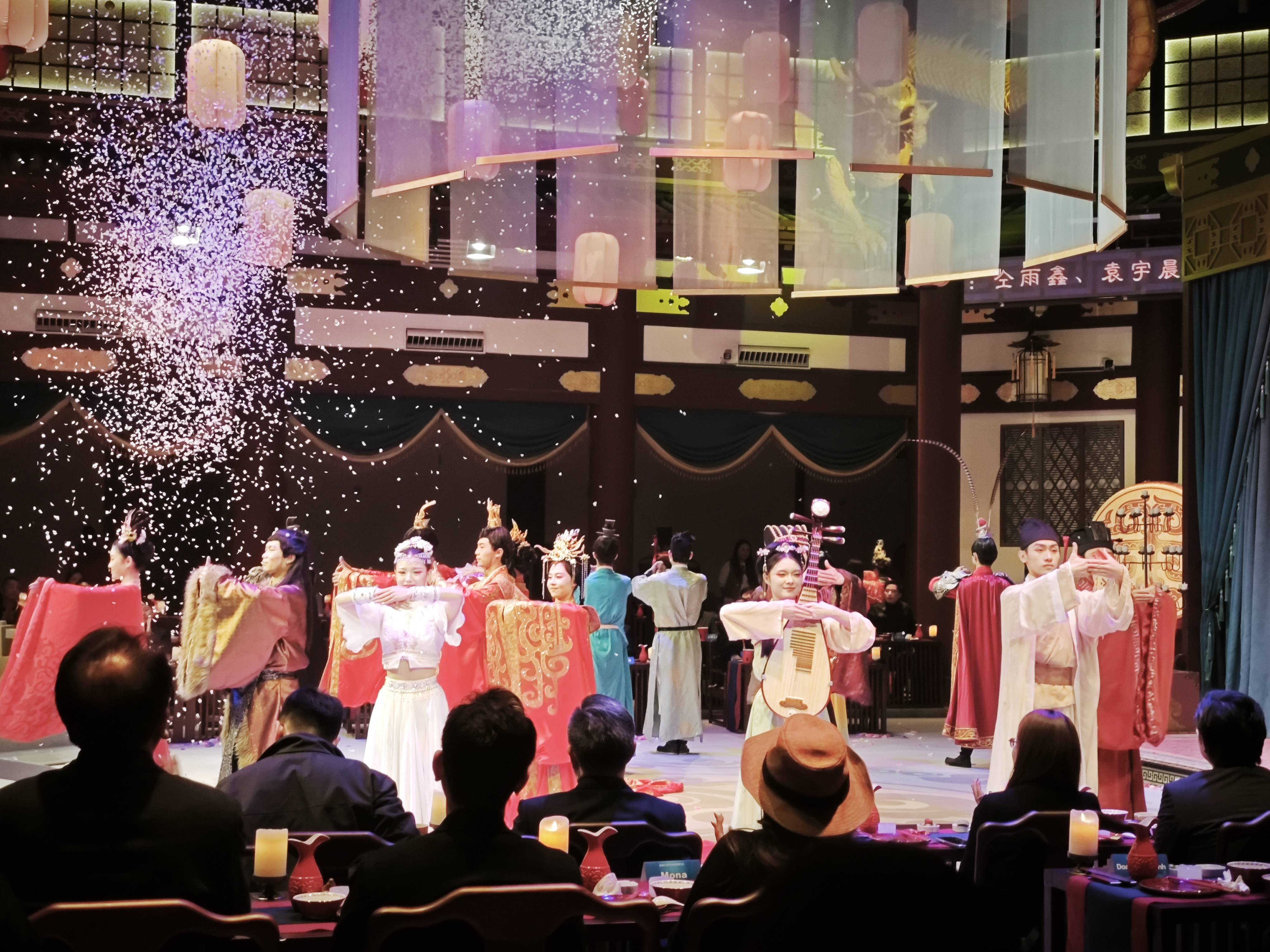 夜幕降临,嘉宾们沿着石阶缓缓登上龟山知音殿,一场《三国群芳宴》沉浸式餐饮秀在此上演,荆楚美食与古风雅乐相映成趣。随后众人乘船夜游长江,江风拂面,两江四岸华灯尽收眼底,“龟蛇锁大江”的雄阔景象引得嘉宾们纷纷举起手机,将璀璨灯火与巍峨大桥一同定格。