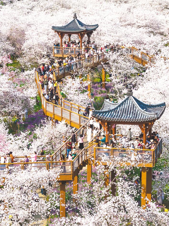 3月27日,武汉东湖樱花园迎来盛花期,前来赏花打卡的游客络绎不绝。(湖北日报全媒记者 薛婷 摄)