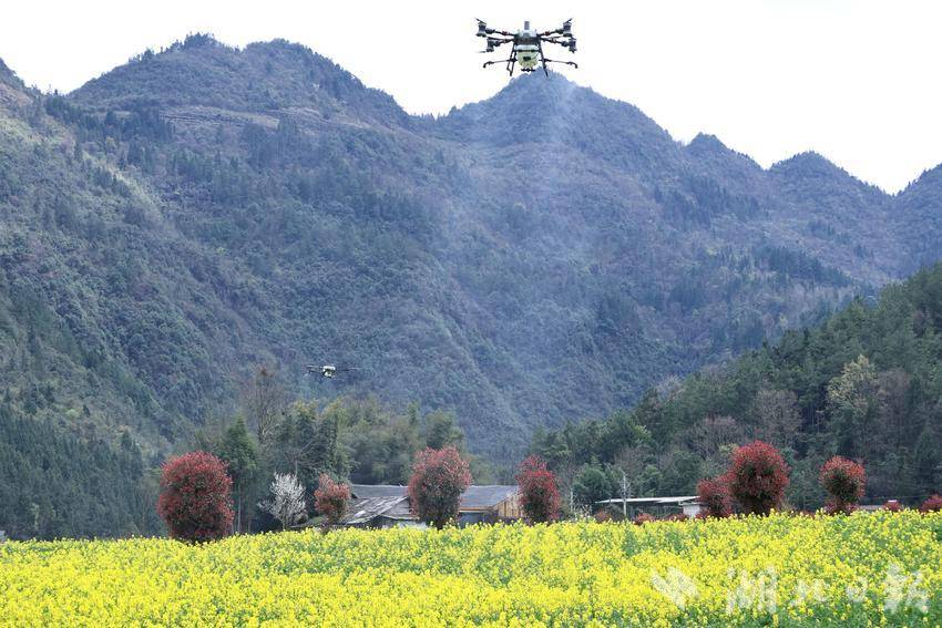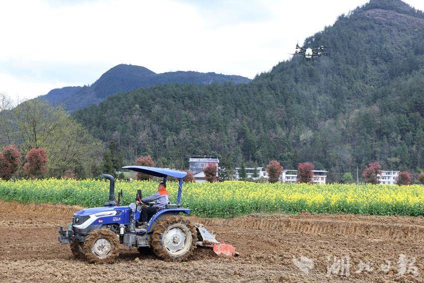 3月26日,曲江镇双拱桥村田间一派繁忙。植保无人机在金黄的油菜花海间精准作业,开展病虫害防治;农机轰鸣深耕整地,为春播夯实基础。作为咸丰县高标准农田建设与稻油产业融合发展的示范窗口,这里田成方、路相通、渠相连,生动展现了山区农业现代化的咸丰实践。(湖北日报客户端通讯员田润、冯程摄)