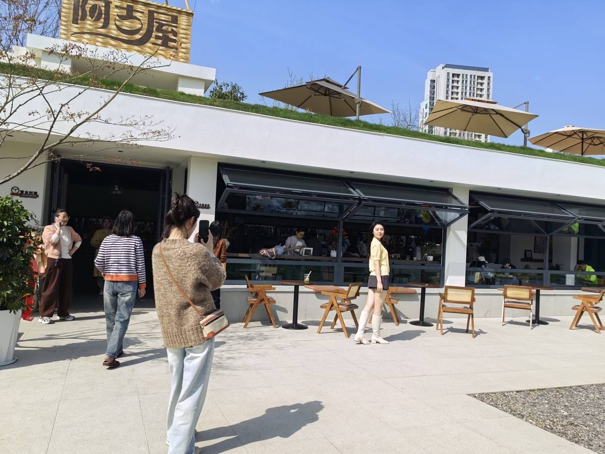 在公园西侧,一处以美学设计为亮点的阿古屋咖啡馆格外吸睛,白色墙壁镶嵌着实木边框,为市民游客打造了一处沉浸式休闲新地标。