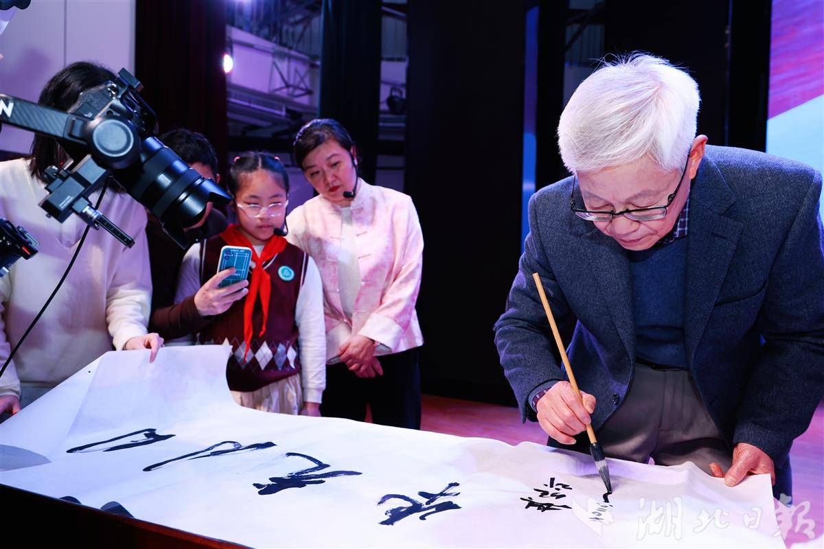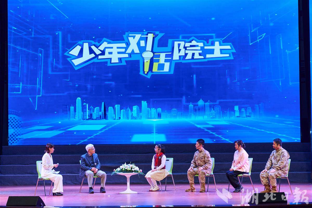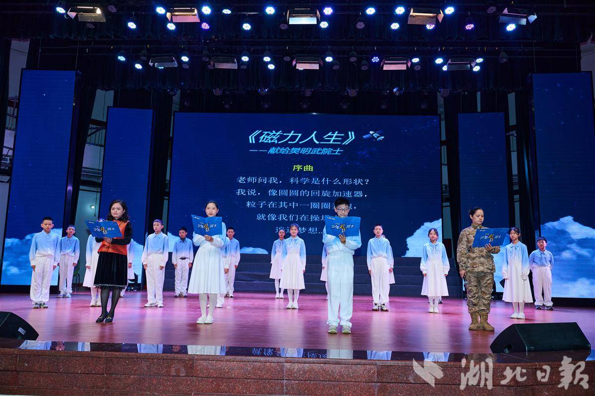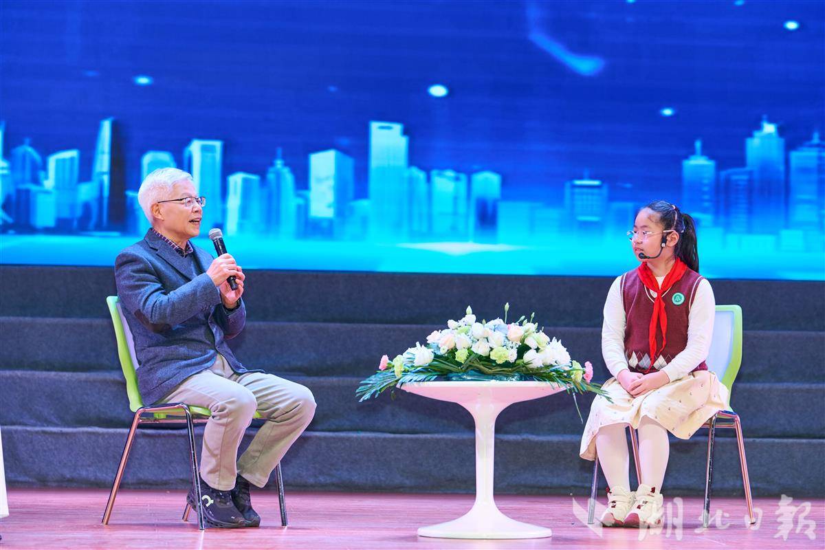 在“少年对话院士”环节,四位代表围绕“星光”“曙光”“晨光”“荣光”四个关键词,与樊院士展开深入交流。光华路小学学生项敏乔问及科研路上的“拦路虎”,樊院士以亲身经历勉励后辈:“科学探索没有坦途,唯有坚持才能抵达彼岸。”中国人民解放军信息支援部队工程大学学员韩宜轩就人工智能时代的军旅建功提问,樊院士深刻阐述了科技强军与人文精神的辩证关系。科学教师陶永红就教学中理论与实验的差异请教引导之道,樊院士强调:科学精神的核心是敢于质疑、勇于求证。项敏乔同学的爸爸身为中国人民解放军信息支援部队工程大学教员,问及“文武兄弟”的家风传承,樊院士分享了家庭教育中的点滴,让现场观众深刻感受到:最伟大的科学成就,往往萌芽于最平凡而深厚的家风土壤之中。随后,著名相声表演艺术家、一级演员陆鸣以快板《文武双星》的视频形式,生动演绎了樊明武院士与其兄樊明文教授的“文武双星”佳话,赢得全场阵阵掌声。汉川市实验小学的师生通过原创歌曲《光的小尾巴》向樊院士致敬,孩子们还以视频形式提出“粒子音乐会”“敢于质疑权威”等富有想象力的科学问题,樊院士一一耐心解答,现场气氛热烈。