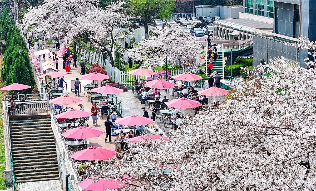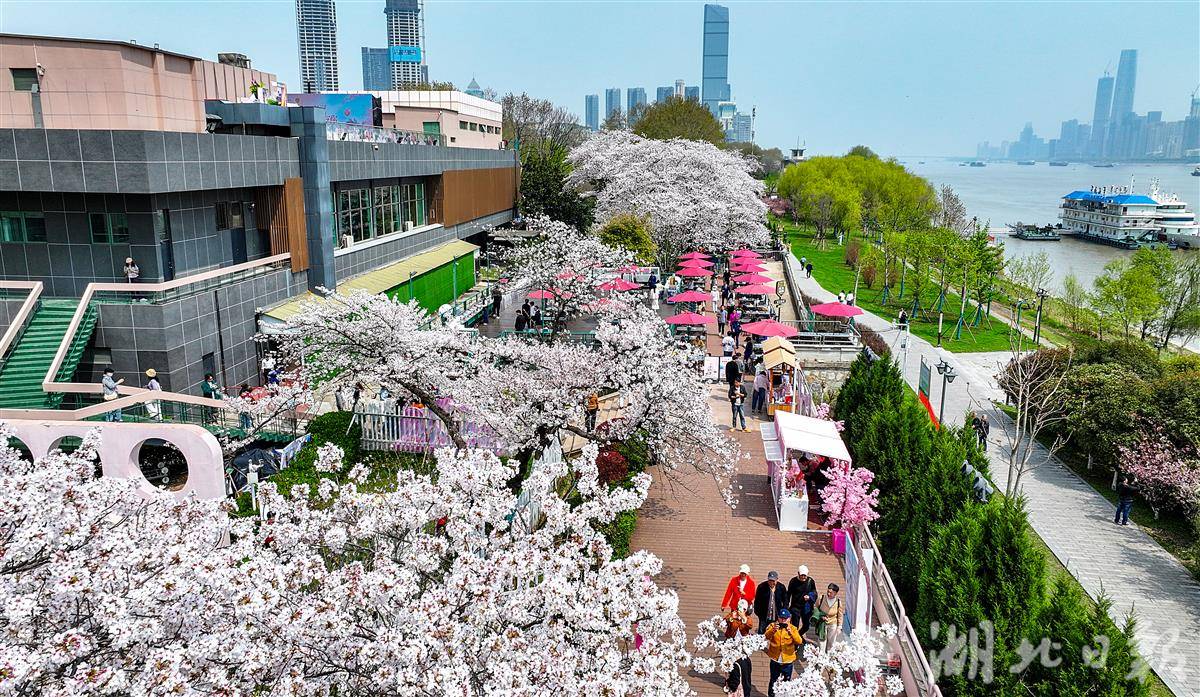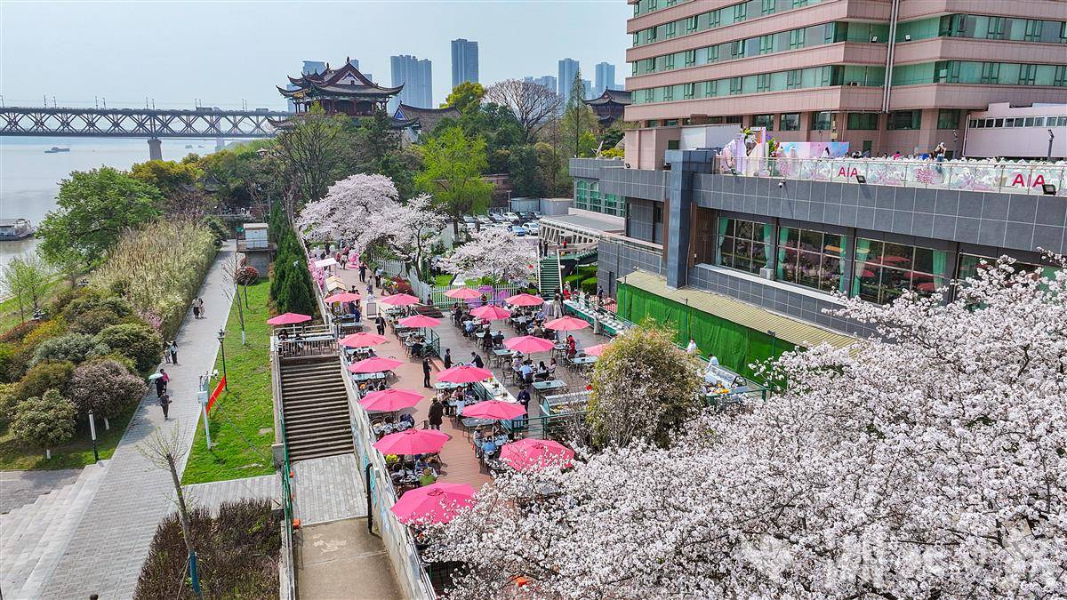 3月28日中午,武汉晴川阁(晴川假日酒店后院的长江畔)下,樱花如云似雪,两处美好在此同时启幕。