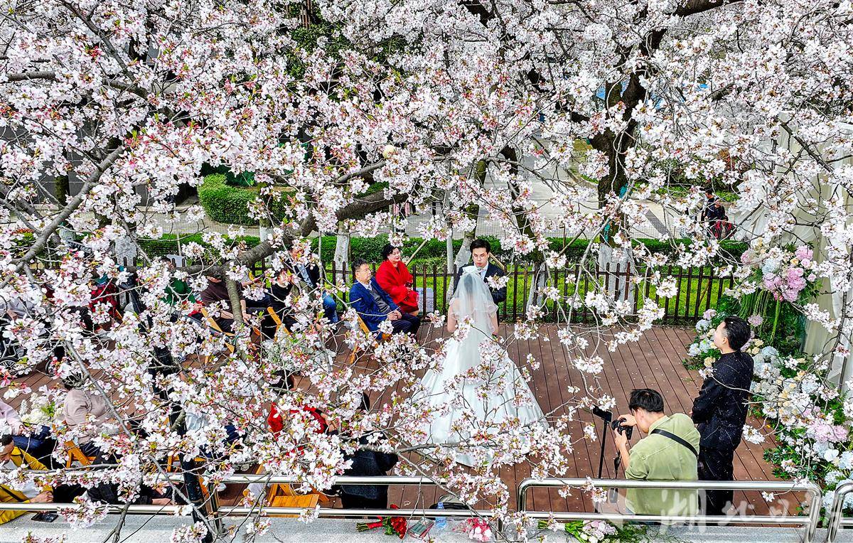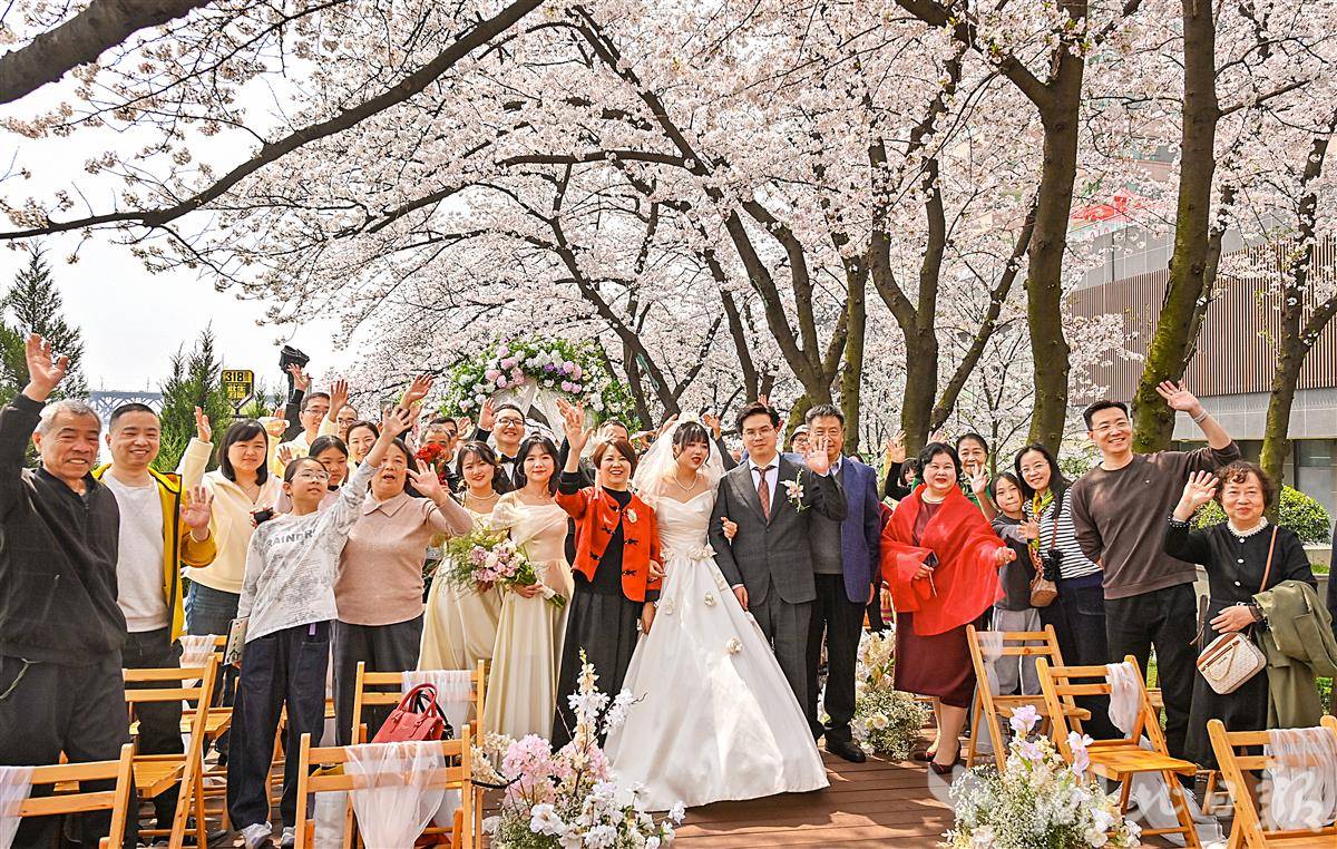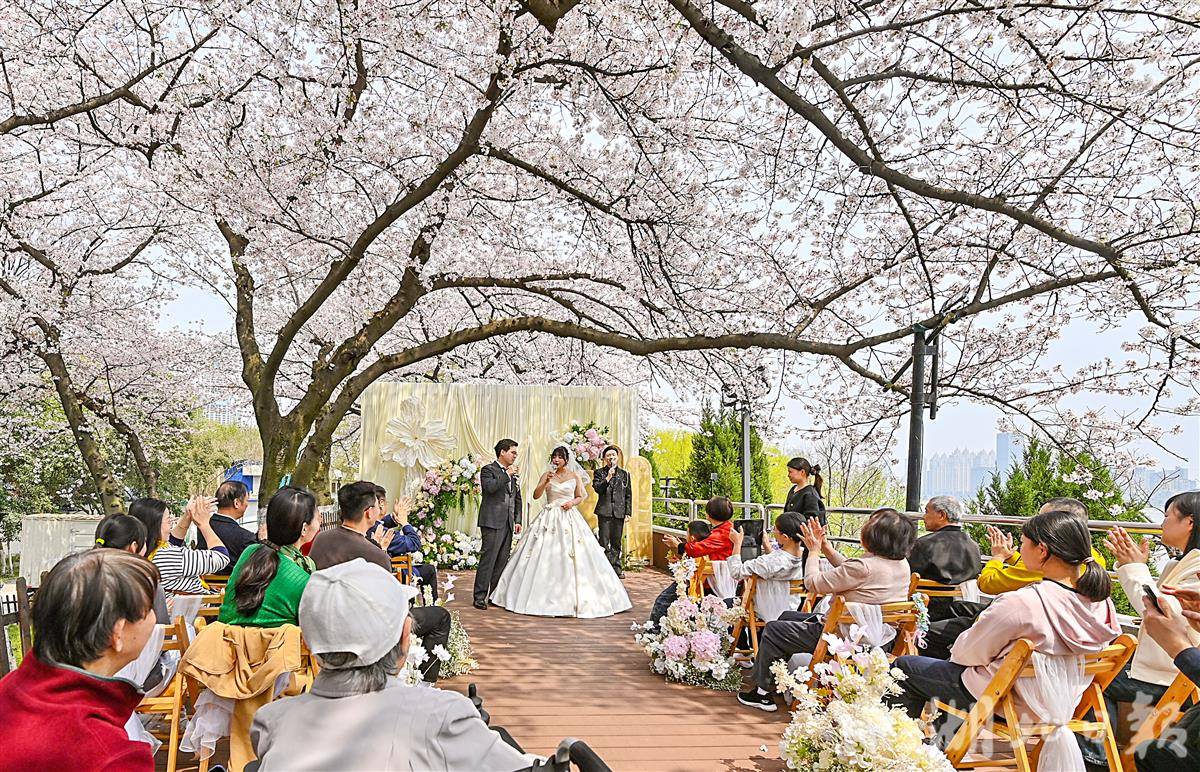 3月28日中午,武汉晴川阁(晴川假日酒店后院的长江畔)下,樱花如云似雪,两处美好在此同时启幕。新人并肩,笑意盈盈,亲友环坐,共证良缘。微风拂过,粉色花瓣如雨般飘落,为这场春日盛典增添了无尽的浪漫与温柔,也定格了属于彼此的甜蜜瞬间。(湖北日报全媒记者 朱熙勇 通讯员 马晓晴 摄)