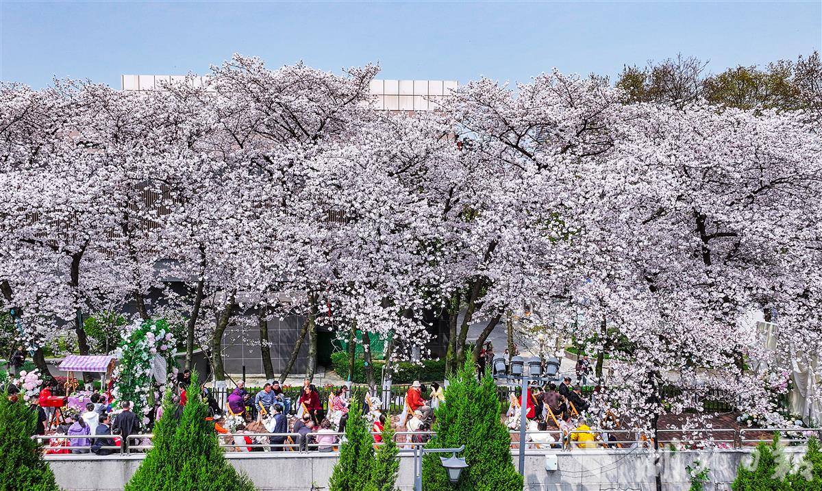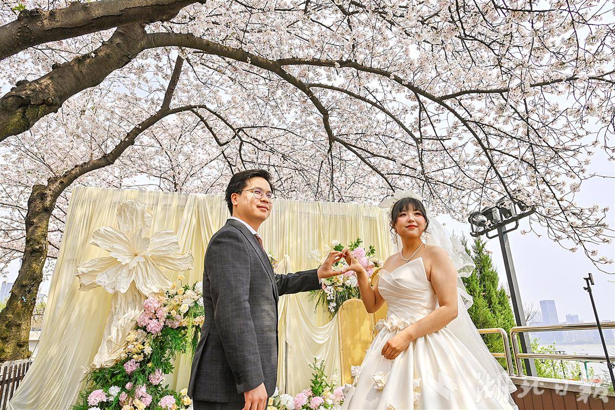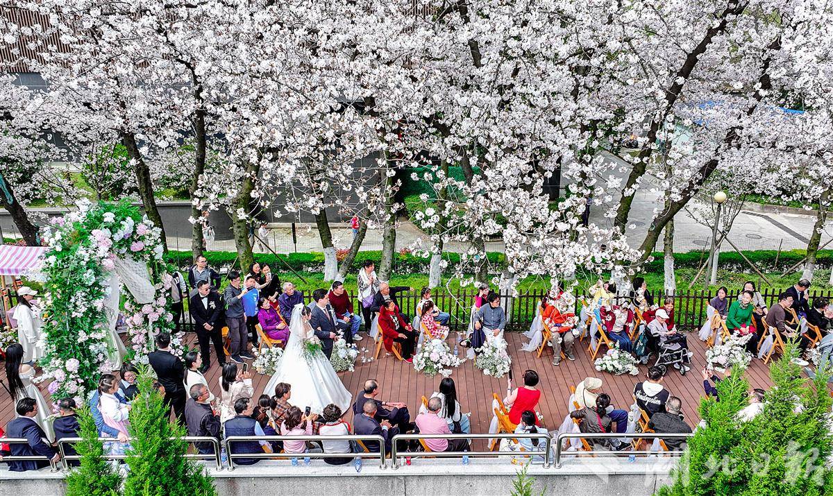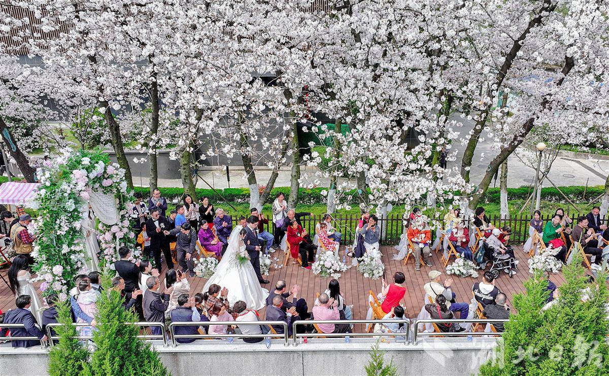 3月28日中午,武汉晴川阁(晴川假日酒店后院的长江畔)下,樱花如云似雪,两处美好在此同时启幕。新人并肩,笑意盈盈,亲友环坐,共证良缘。微风拂过,粉色花瓣如雨般飘落,为这场春日盛典增添了无尽的浪漫与温柔,也定格了属于彼此的甜蜜瞬间。(湖北日报全媒记者 朱熙勇 通讯员 马晓晴 摄)
