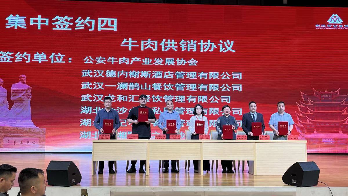 签约环节,公安县与省农科院签订“双百”科技赋能战略合作框架协议,公安牛肉产业高质量发展办公室与武汉老肖餐饮有限公司签订全面战略合作协议、与湖北中云数智农业有限公司签订“公安牛肉两湖地区千城万店”战略协议,公安牛肉协会与武汉市公安商会5家餐饮会员企业签订供销协议。