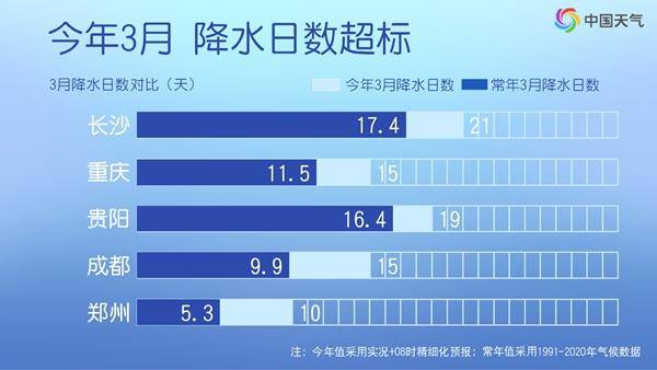 3月15日以来,湖南中北部和西部、江西中北部、湖北南部及贵州中东部降水量较常年同期偏多3~8成,湖南北部、贵州东部等地部分地区偏多1倍以上。像长沙,今年3月以来的雨日已有21天,这还没算上阴天,太阳露面的时间屈指可数。