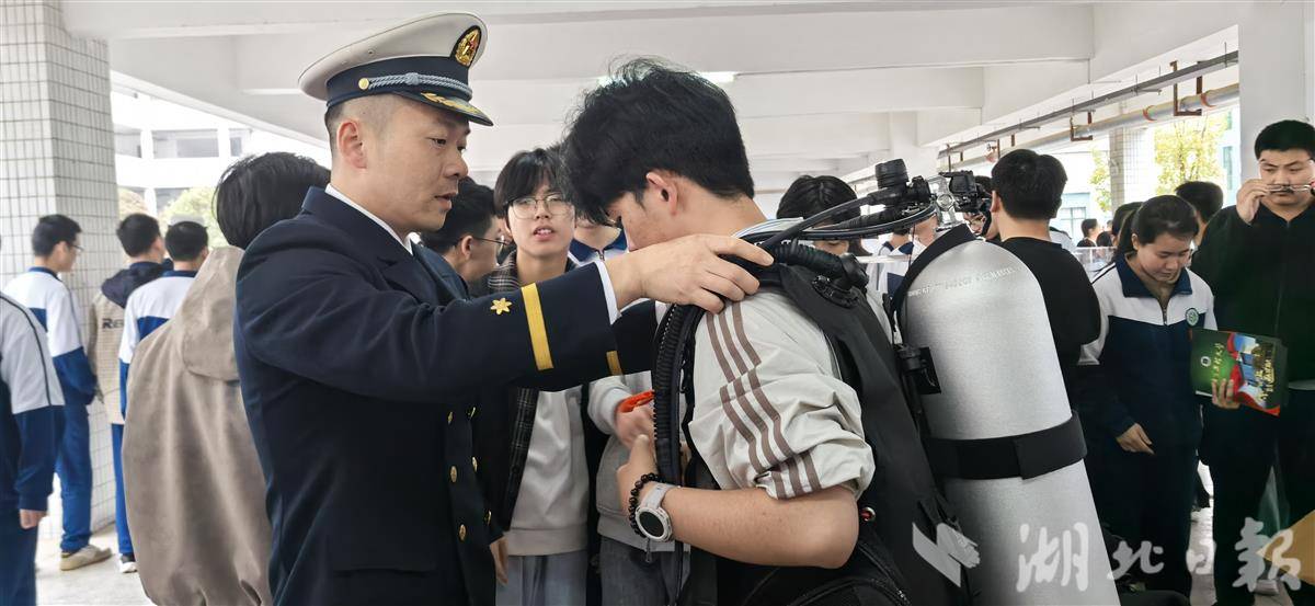 官东(左)为学子穿戴潜水装备。
