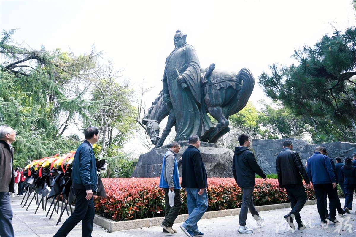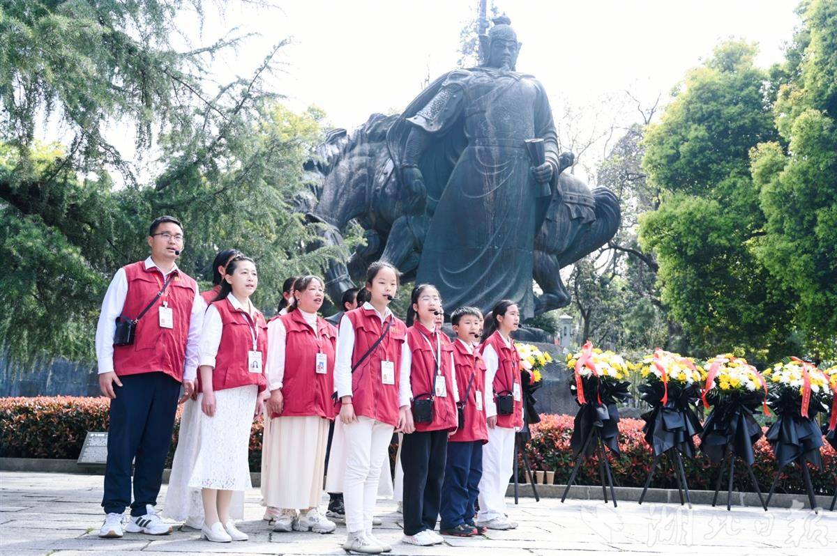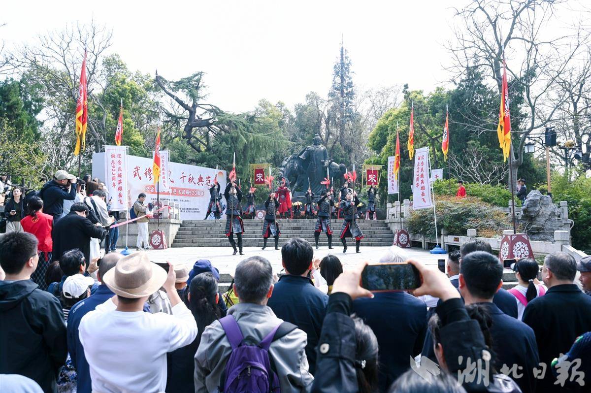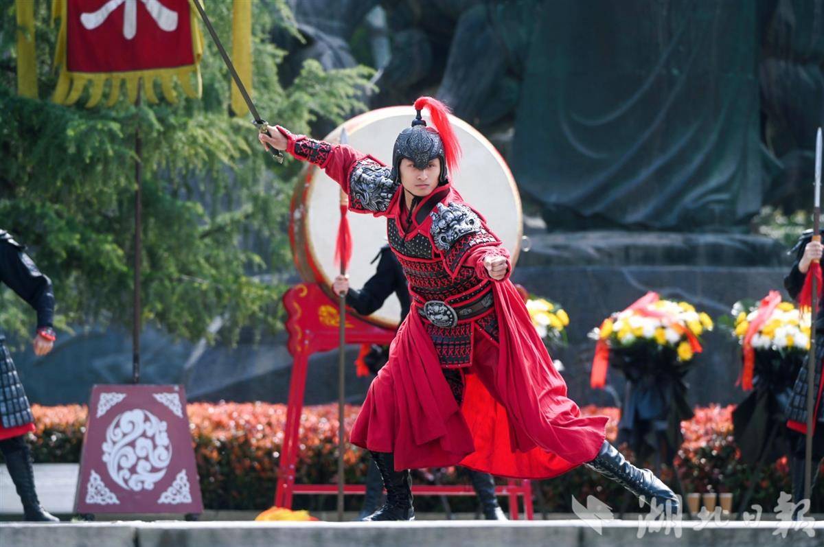 活动现场,在奏唱国歌之后,相关单位代表依次向岳飞铜像敬献花篮,全体参与人员行三鞠躬礼,并绕行岳飞铜像一周,表达对英雄的崇高敬意和无限缅怀。黄鹤楼文化志愿者带来的岳飞词作朗诵,以及现场沉浸式情景节目《精忠报国》等,则以艺术形式再现了岳飞的家国情怀与英雄气概。