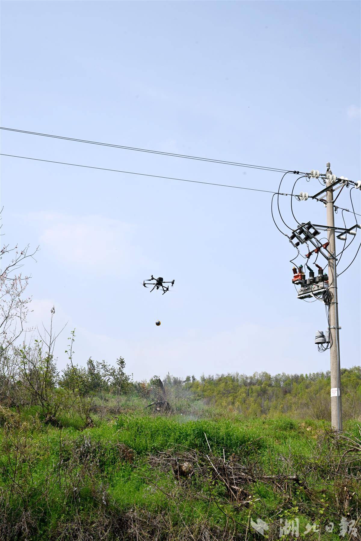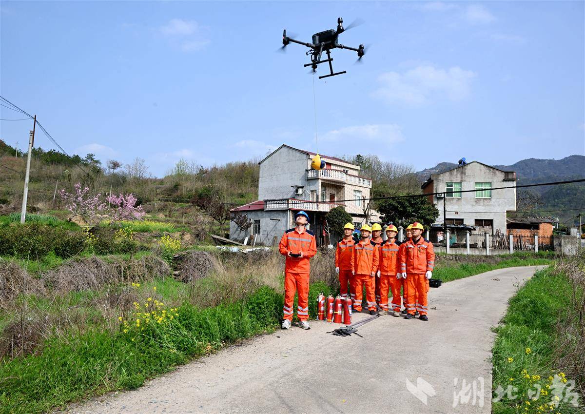 湖北日报讯(记者王欣、通讯员余健兵、何瑶、王勇波、汪正攀)“山上10千伏501柳林线下面有烟,快用无人机飞过去看看!”3月27日,在孝感市孝昌县小悟乡陆冲村,一场模拟祭祀引发山火、威胁供电线路安全的应急演练正在进行。巡线人员肖勇发现火情后,第一时间提醒同事汪广文操作无人机升空,向“火点”飞去。