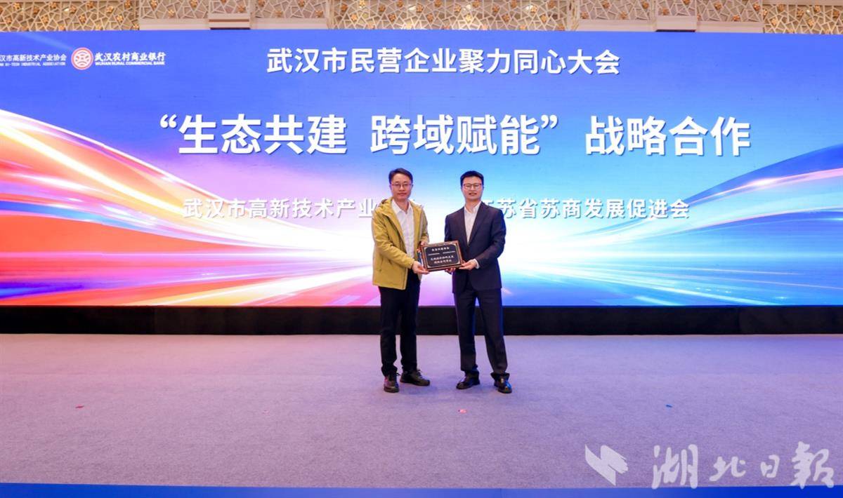 武汉市高新技术产业协会会长吴剑文向江苏省苏商发展促进会颁发“区域经济协同发展战略合作单位”牌匾。双方将以此为契机,搭建苏鄂民企交流平台,推动资源对接与产业协同。