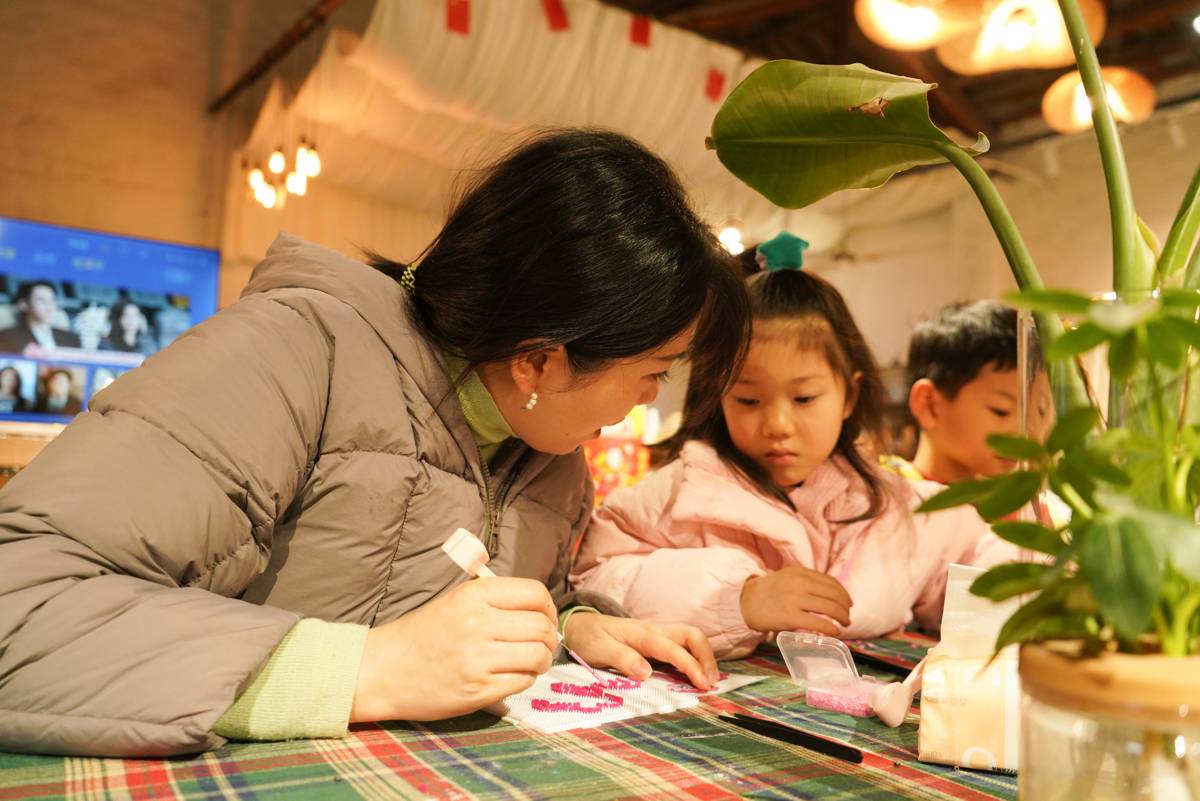 妈妈带着女儿体验拼豆。(湖北日报全媒记者 赵怡然 摄)