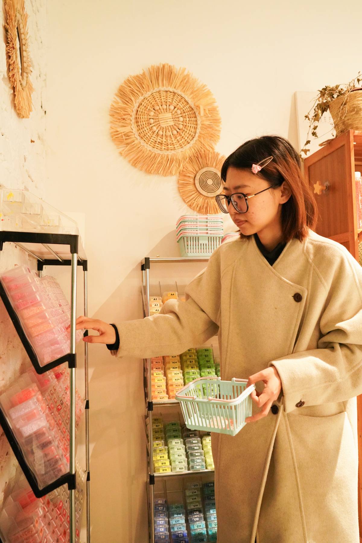 店里集合了陶艺、油画、拼豆等多种手作项目。从去年10月开始,拼豆在网上越来越火。陈晓月回忆,那时候进店的客人,十个里有八个都是奔着拼豆来的。