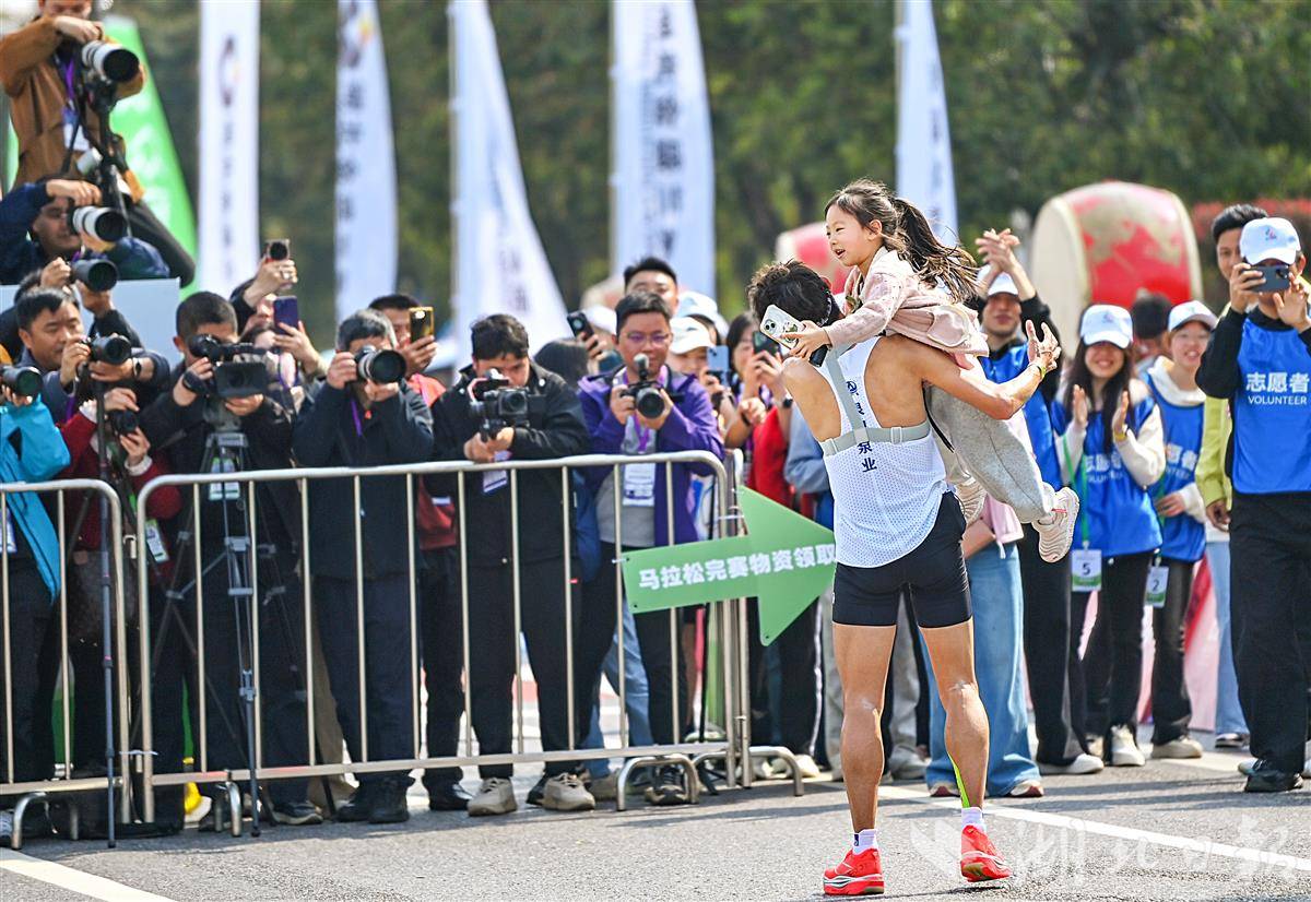 咸宁本土选手吴浩然夺得全程马拉松男子组冠军,现场抱起女儿。