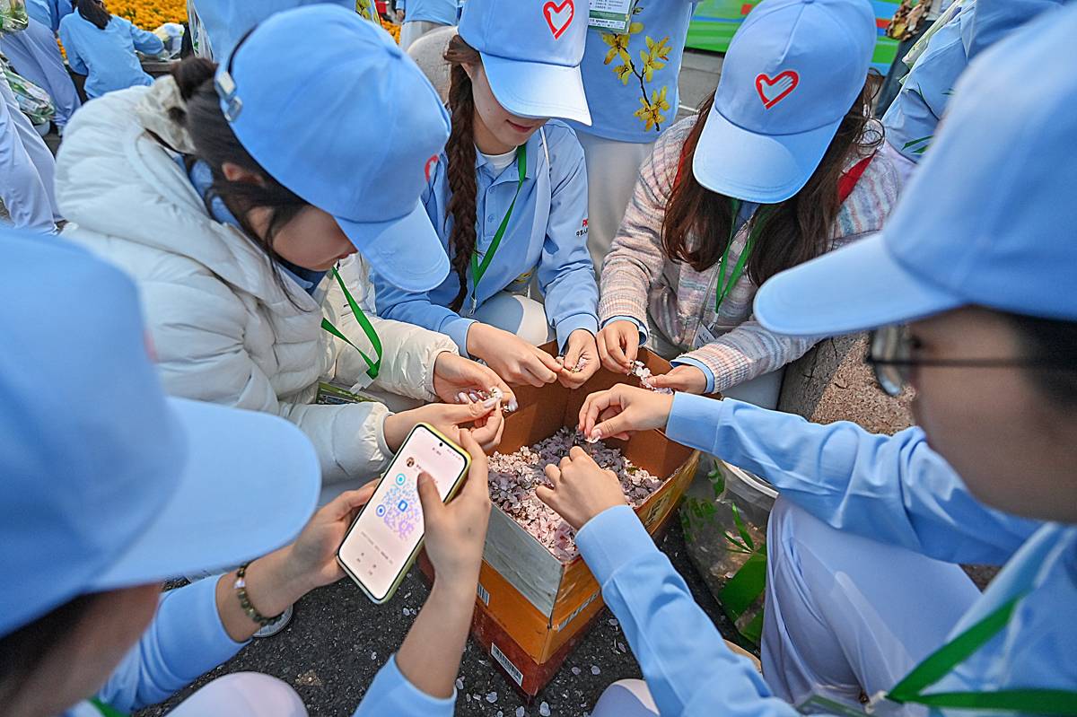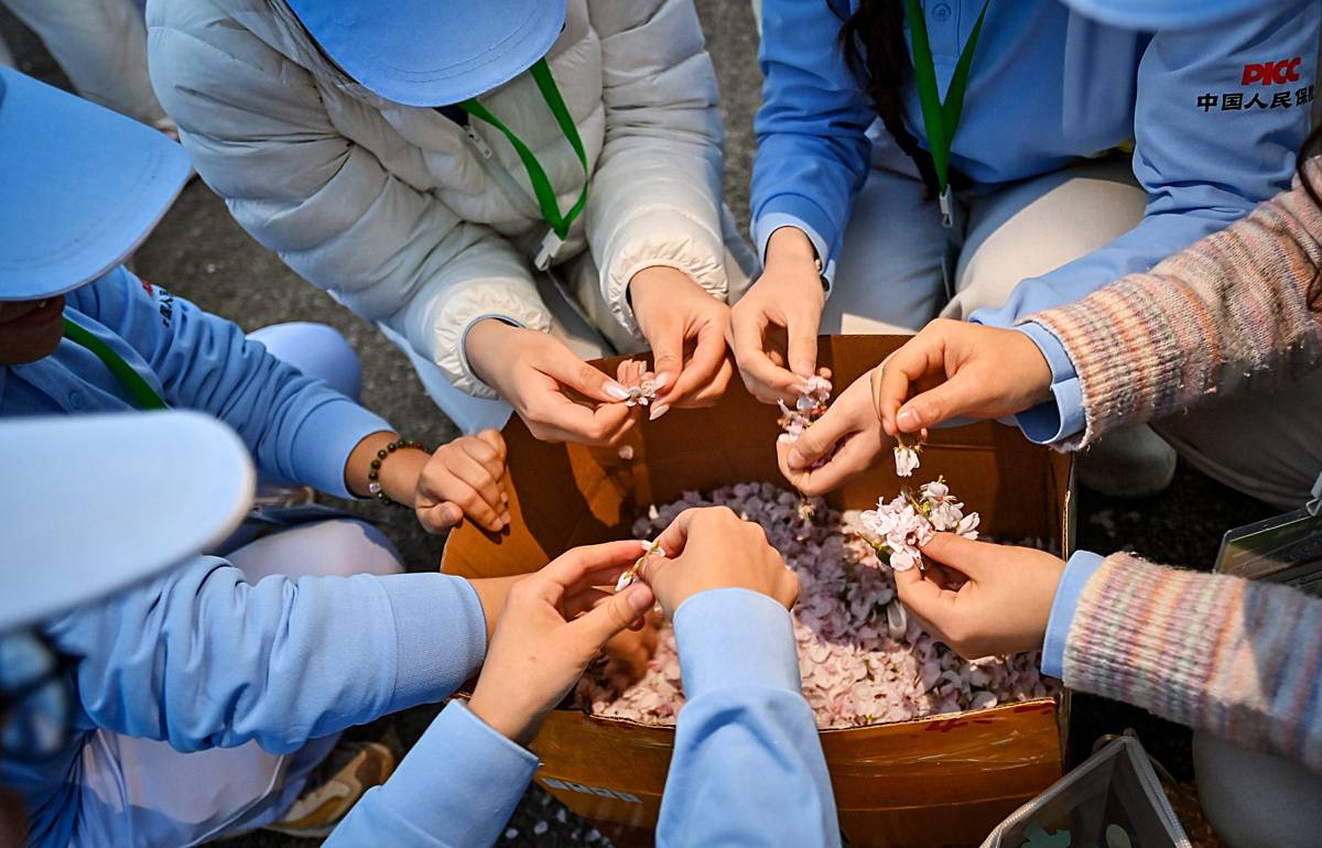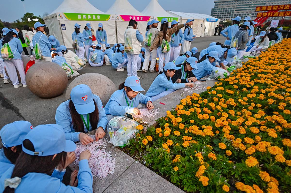 3月29日凌晨,为了人工造出飘落在赛道上的“樱花雨”,来自湖北科技学院教育学院的30名女志愿者凌晨5:30集合,采摘1公斤多的野樱花。