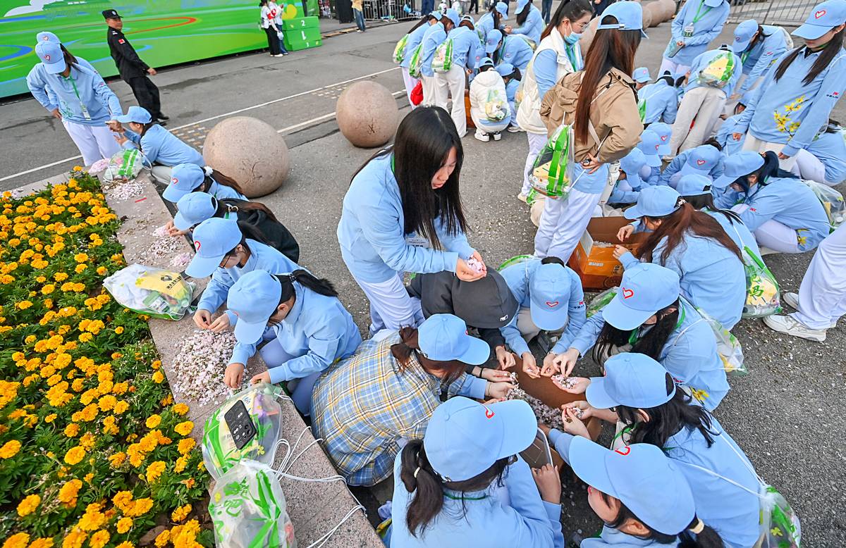 3月29日7时30分,一声鸣笛响起,漫天“樱花雨”飘落,2026咸宁马拉松激情开跑。当日凌晨,为了人工造出飘落在赛道上的“樱花雨”,来自湖北科技学院教育学院的30名女志愿者凌晨5:30集合,采摘1公斤多的野樱花。志愿者们在现场撕下花瓣,装上无人机,当发令枪响,漫天的“樱花雨”从天而降,为参赛者带来惊喜。(湖北日报全媒记者 朱熙勇 摄)