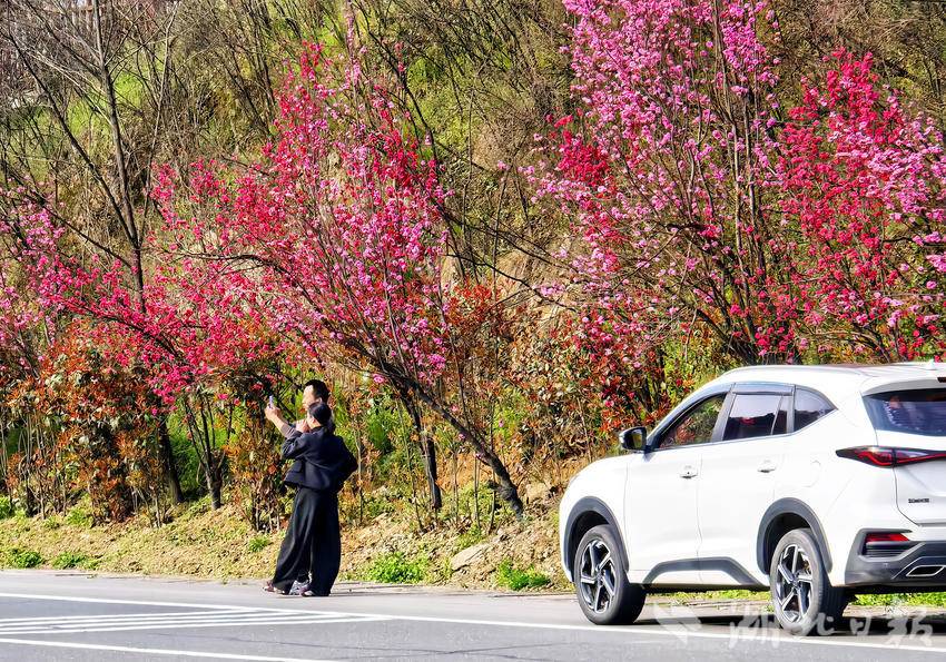 自三月中旬起,丹江口境内国、省、乡道沿线繁花次第绽放:玫瑰红、正红、粉红、洁白的桃花,金黄耀眼的迎春花,一丛丛铺展路边的紫云英竞相吐艳。将道路两侧织就成缤纷彩带,与疾驰而过的车辆相映成趣,勾勒出一幅幅动静相宜的生态美景。不少市民自驾停靠路边,漫步花下赏花留影,沉醉于烂漫春光之中。