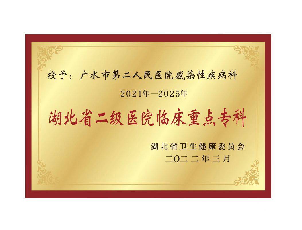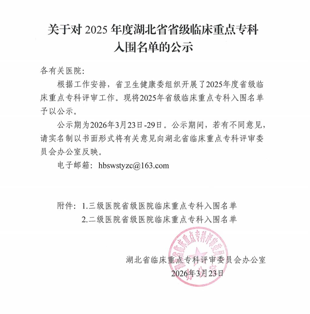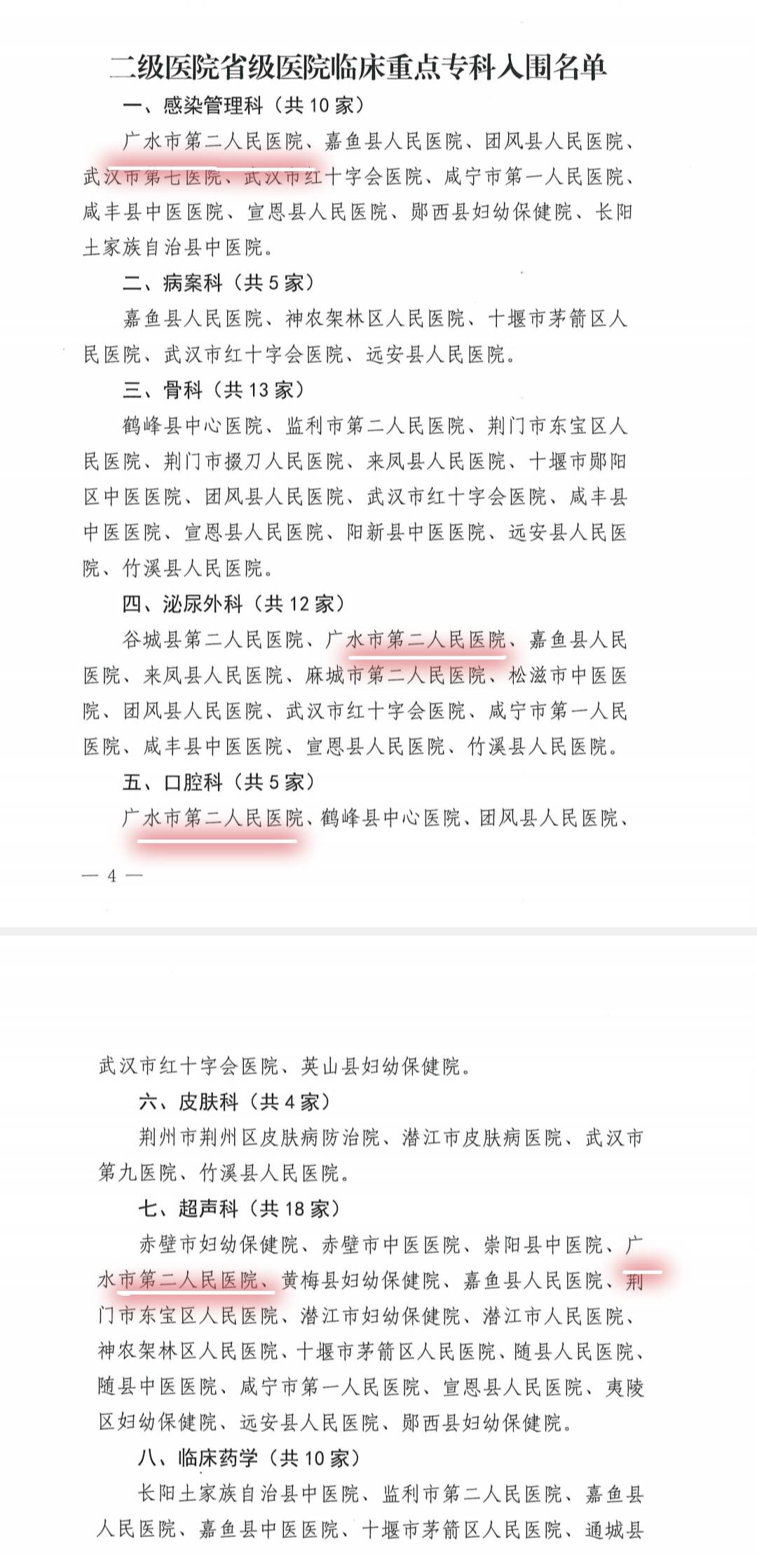 湖北日报讯(通讯员 刘小斌)3月23日,湖北省卫生健康委公示2025年度省级临床重点专科入围名单,广水市第二人民医院感染管理科、泌尿外科、口腔科、超声科4个专科成功入选,成为本次评审中二级医院中多科入围的标杆之一,标志着该院学科建设与综合医疗服务能力迈入省级“第一方阵” 。