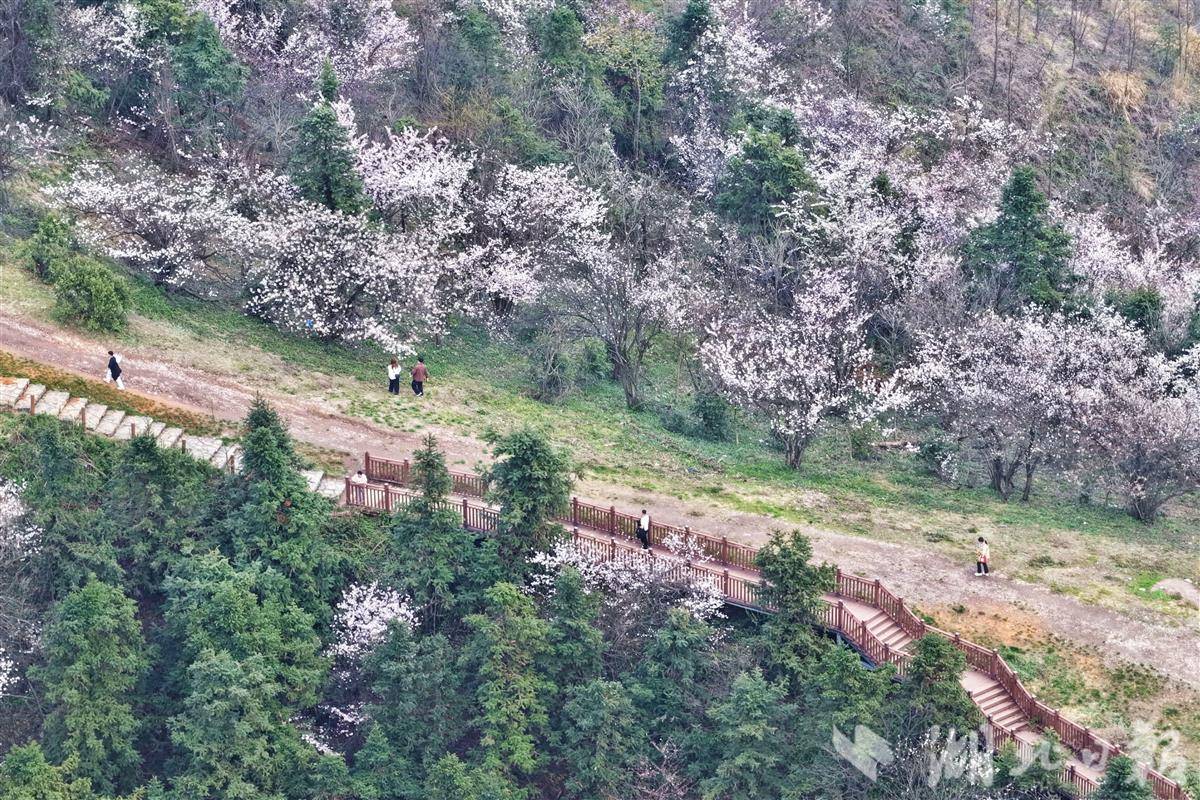 咸安大幕山野樱绽放,引得众多游客前来打卡拍照。(湖北日报全媒记者 陈少哲 摄)