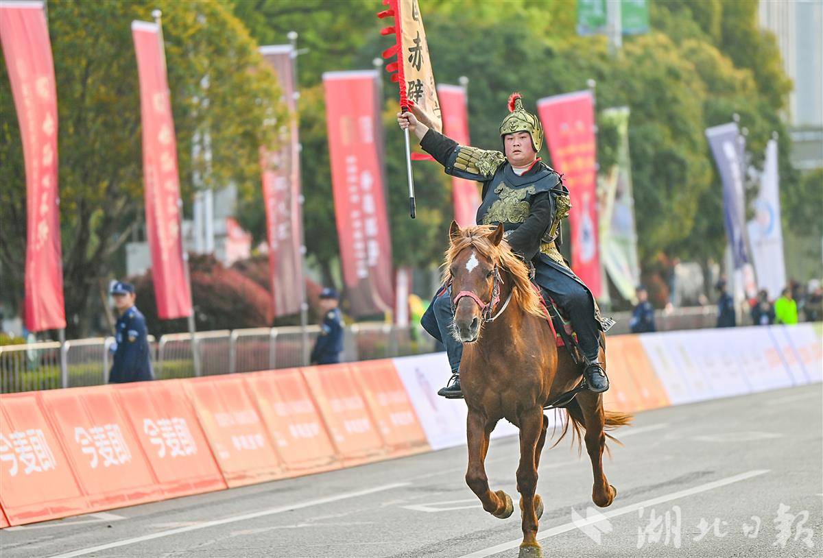 比赛开始前,起点处附近的跑道上,上演一场“金戈铁马”的表演。演出中,鼓角雄浑,战马奔腾,身着铠甲的士兵列阵前行,尽显豪迈气魄,沉浸式演出将人们的思绪拉回到1800多年前的三国时代。三国赤壁,英雄咸宁,因为一场马拉松,在那一刻有了回响。