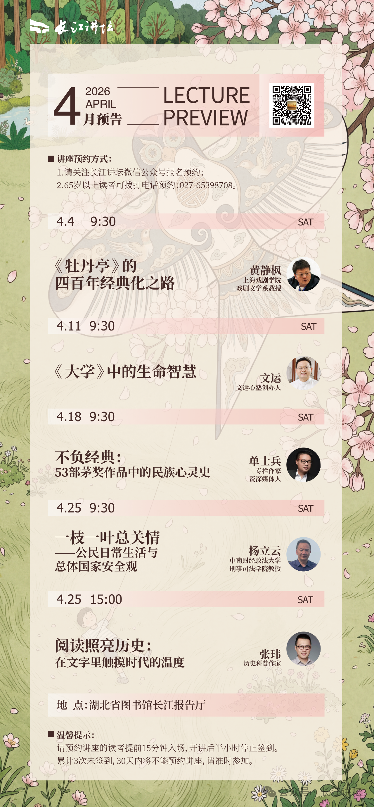 湖北日报讯 (记者王晶、通讯员谢宁)3月30日,湖北省图书馆发布4月长江讲坛讲座预告,多场讲座聚焦传统经典如何走向大众、影响社会。
