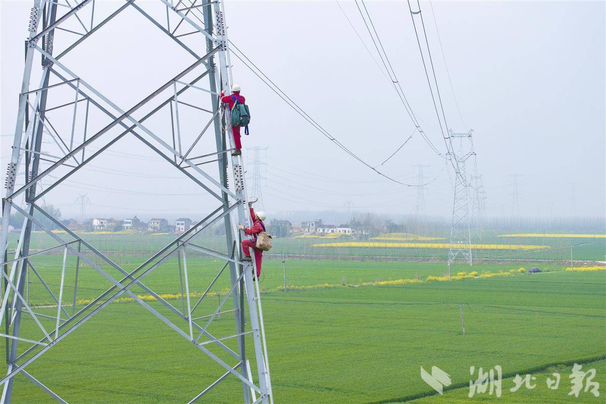 3月25日,荆门市沙洋县境内,电力技术人员正在攀爬220千伏源林线172号塔,安装防鸟装置。