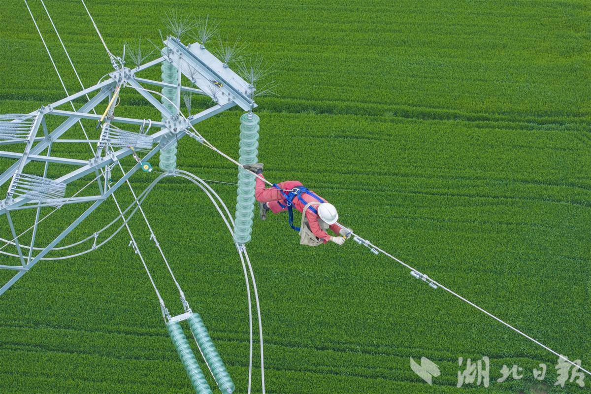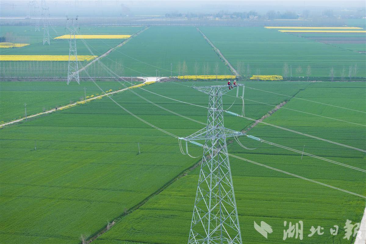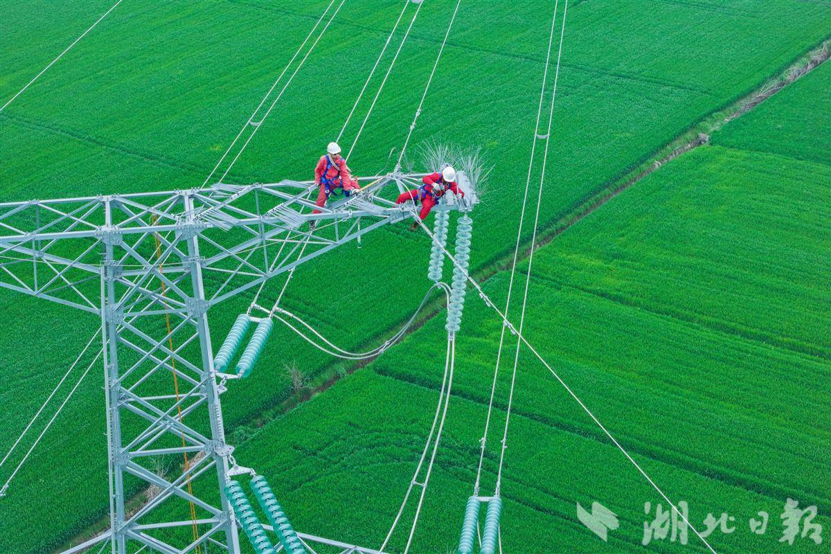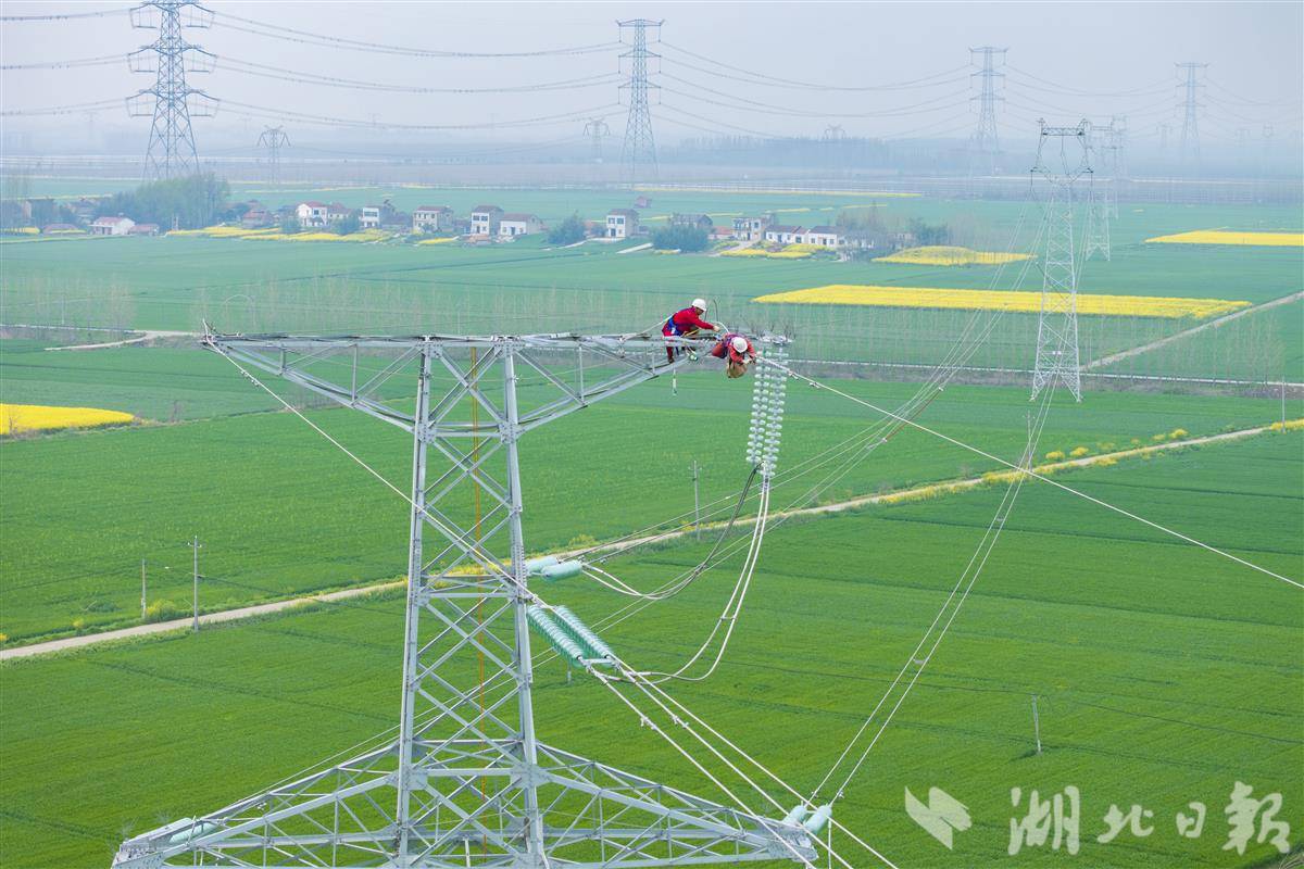 3月25日,荆门市沙洋县境内,电力技术人员正在220千伏源林线172号塔安装防鸟装置,保障鸟类与线路安全。