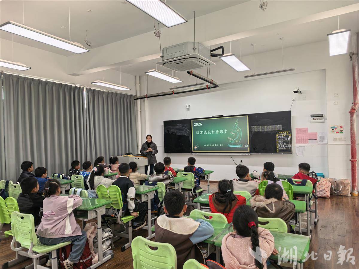 与此同时,武汉东西湖区的科普团队正带着育才优学幼儿园的孩子们走进防震减灾科普馆。