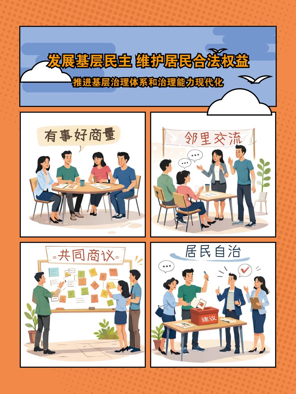 作品简介:这幅四格漫画生动展现了后湖街道基层民主实践场景:辖区居民们围坐协商,邻里之间热络交流,遇事共同商议,还能通过自治渠道提建议,实实在在维护自己的权益。生动展现了基层民主的温度,也让大家看到共建美好家园的满满活力。