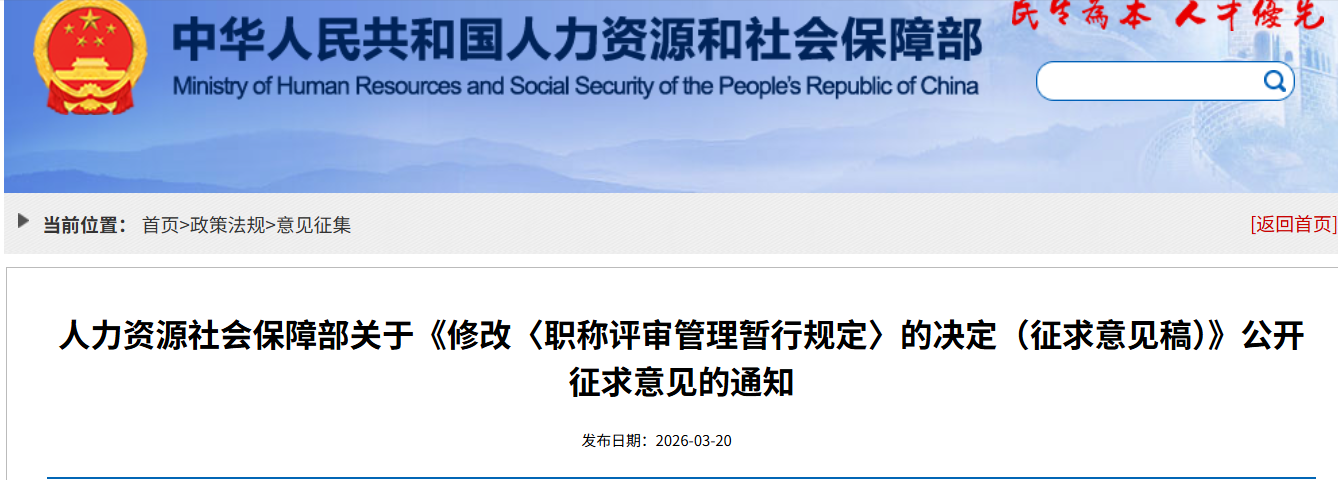 《人力资源社会保障部关于修改〈职称评审管理暂行规定〉的决定(征求意见稿)》(以下简称《征求意见稿》)。