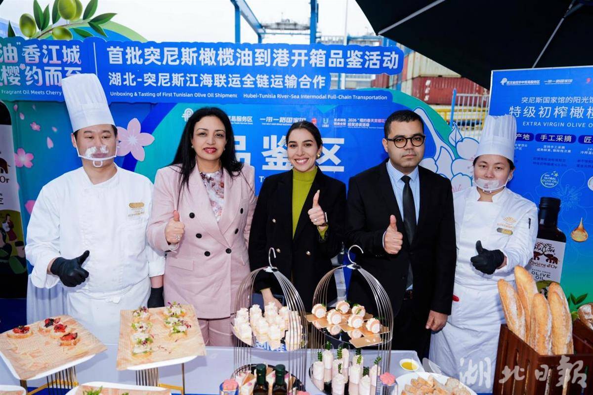 当天,“首批突尼斯橄榄油到港开箱品鉴活动暨湖北—突尼斯江海联运全链运输合作仪式”在武汉阳逻国际港区中远海运CSP码头举办,突尼斯、土耳其驻华使节、俄罗斯驻武汉总领事,湖北省、武汉市相关部门及企业负责人等嘉宾出席,共同见证突尼斯橄榄油首次以江海联运模式直达阳逻港,标志着鄂突经贸物流合作迈入全链条新阶段。