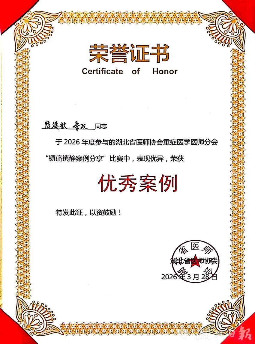 湖北日报客户端讯(通讯员李琴)近日,由湖北省医师协会主办的2026年重症医学医师分会学术会议暨镇痛镇静护理案例展示赛在武汉圆满落幕。钟祥市人民医院重症医学科凭借扎实的临床实践与创新的护理方案,成功斩获“优秀案例奖”,充分彰显了科室在重症镇痛镇静护理领域的专业实力与学术水平。