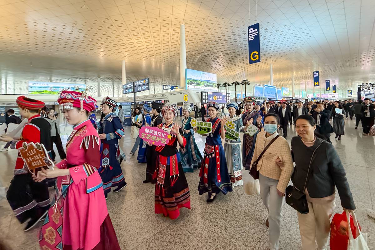 2026年3月31日,天河机场T3航站楼举办“邂逅天河 相邀恩施”恩施风情推广活动。在安检区及出发大厅、到达大厅,演员与工作人员身着民族服饰与旅客巡游互动,不少推着行李箱的旅客纷纷驻足观看、拍照打卡。活动同步推出快闪表演、文旅展销及住宿门票补贴政策,以“文旅 + 机场”模式,全方位释放恩施春日魅力,助力春季旅游市场实现 “开门红”。(湖北日报全媒记者 倪娜 通讯员 夏晨晖 摄)