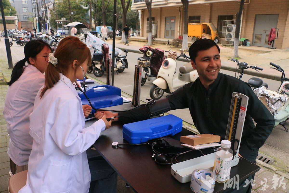 在另一边的体育场旁,有着29年历史的白衣天使志愿者服务联合队设立了“校园爱心义诊”点。经过严格培训考核的医学生志愿者们,正熟练地为过往同学测量血压、讲解健康贴士。这项坚持了12年的义诊活动,每次服务师生近百人。矿业专业的大二学生艾克热木测完血压后表示:“上场打球前测一下,心里踏实多了。”