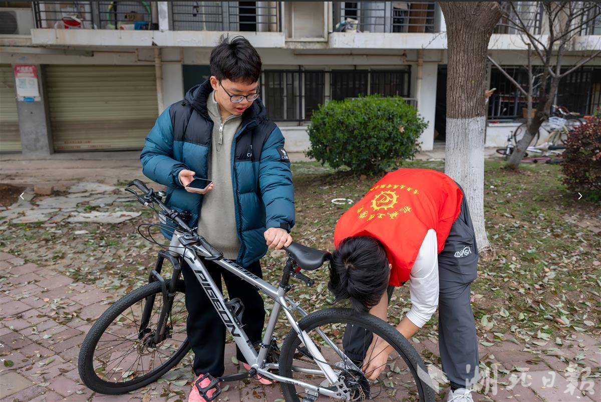 在武科大学生公寓旁的“小绿车”维修站,机械工程学院的志愿者们正熟练地拆卸、调试、组装自行车。这处由学生自发组织的维修站,自2017年起已连续9年于每周末“营业”,不仅免费解决校园自行车的日常故障,还现场科普安全用车知识。