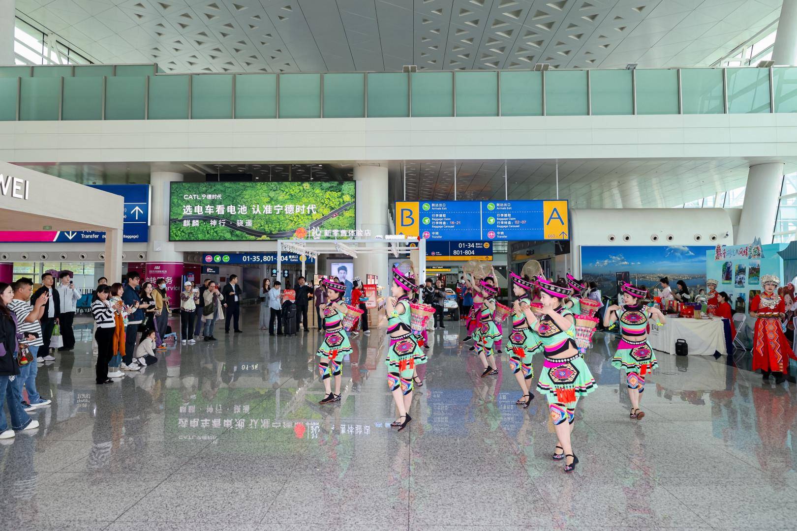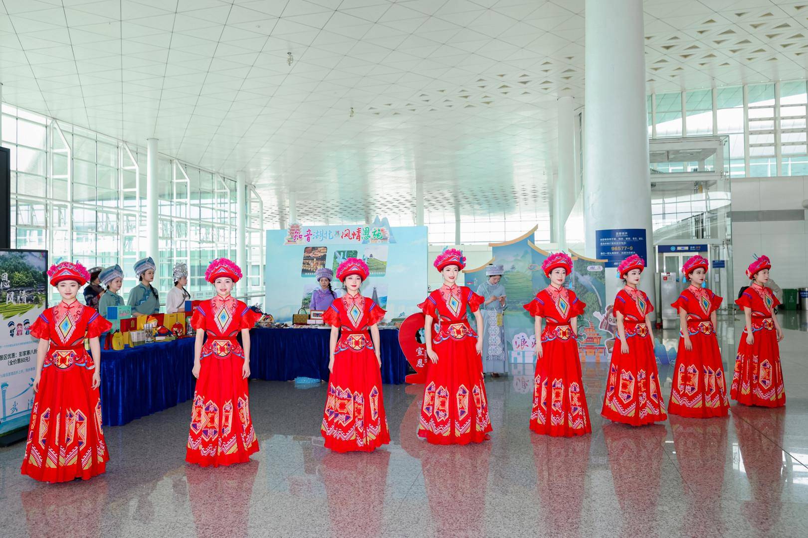 除了主舞台展演,机场内还设置了9个快闪点位,集中呈现恩施市女儿会、利川龙船调、巴东峡江号子等各县市特色文化元素。茶艺表演、傩面展演、快闪舞蹈轮番登场,山水风光、非遗文创、特色茶品一一亮相。楚妞、天崽、中转鸭等机场IP人偶穿梭其间,与旅客合影互动,让候机时光变成一场与恩施不期而遇的文旅体验。